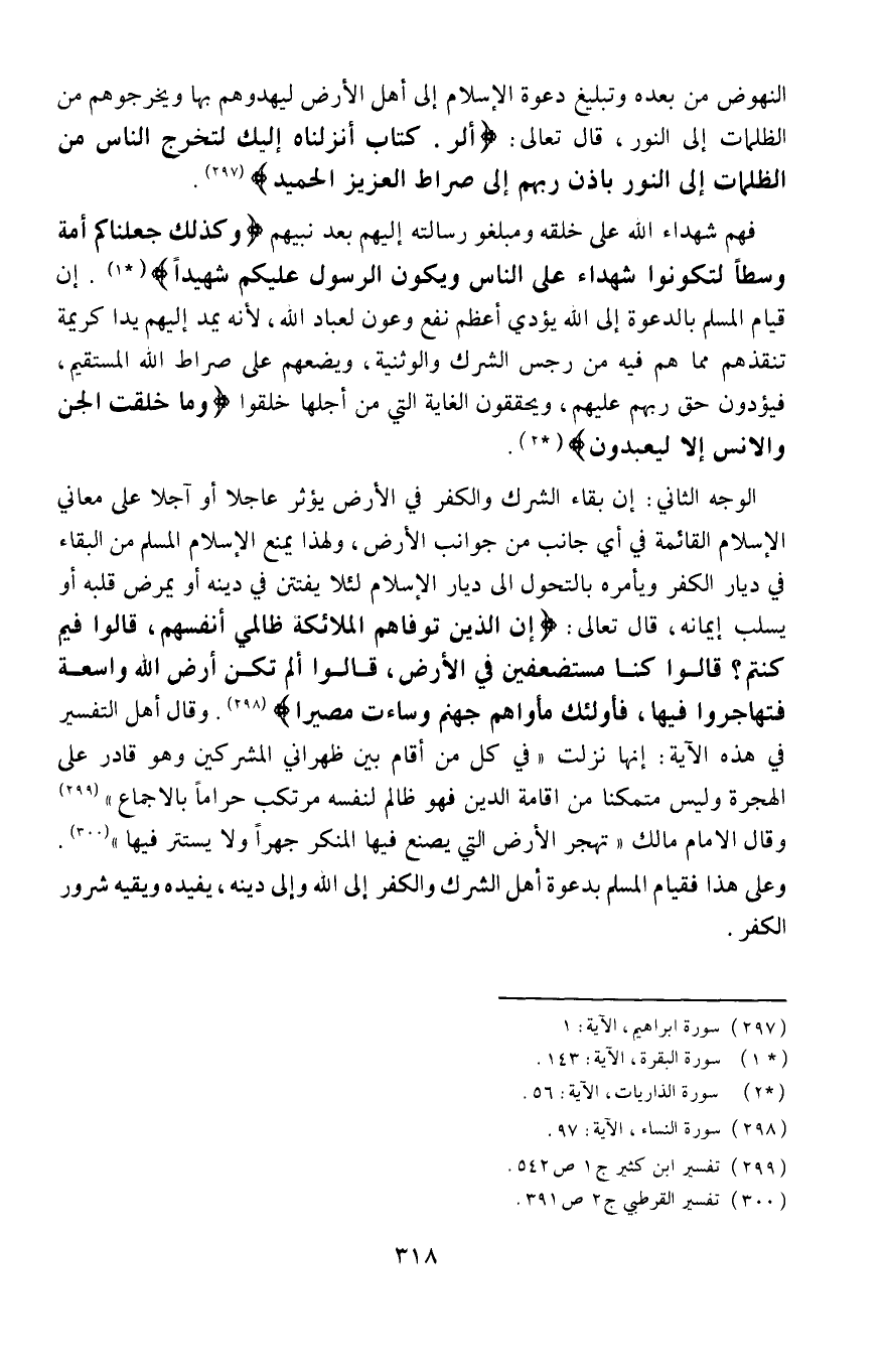 الوجه الثاني: إن بقاء الشرك والكفر في الأرض يوثِّر عاجلًا أو آجلًا على معاني الإسلام القائمة في أيِّ جانب من جوانب الأرض، ولهذا يمنع الإسلام المسلم من البقاء في ديار الكفر، ويأمره بالتحوّل إلى ديار الإسلام؛ لئلَّا يفتتن في دينه أو يمرض قلبه أو يسلب إيمانه، قال تعالى: {إِنَّ الَّذِينَ تَوَفَّاهُمُ الْمَلَائِكَةُ ظَالِمِي أَنْفُسِهِمْ قَالُوا فِيمَ كُنْتُمْ قَالُوا كُنَّا مُسْتَضْعَفِينَ فِي الْأَرْضِ قَالُوا أَلَمْ تَكُنْ أَرْضُ اللَّهِ وَاسِعَةً فَتُهَاجِرُوا فِيهَا فَأُولَئِكَ مَأْوَاهُمْ جَهَنَّمُ وَسَاءَتْ مَصِيرًا} 4، وقال أهل التفسير في هذه الآية: إنها نزلت في كل من أقام بين ظهراني المشركين وهو قادر على الهجرة وليس متمكنًا من إقامة الدين، فهو ظالم لنفسه مرتكب حرامًا بالإجماع5.