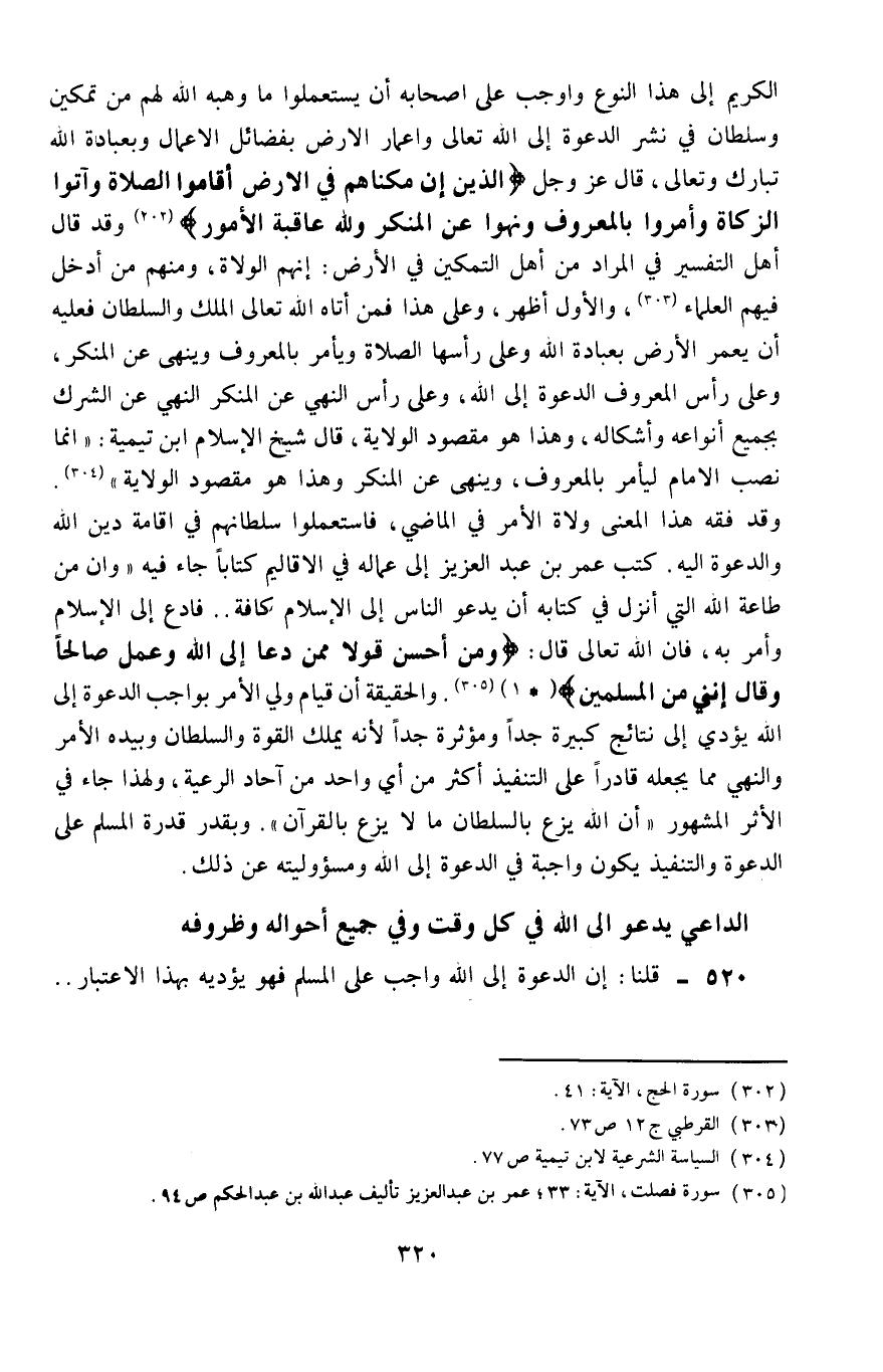 وقد فَقِه هذا المعنى ولاة الأمر في الماضي، فاستعملوا سلطانهم في إقامة دين الله والدعوة إليه، كتب عمر بن عبد العزيز إلى عمَّاله في الأقاليم كتابًا جاء فيه: "وإن من طاعة الله التي أنزل في كتابه أن يدعو الناس إلى الإسلام كافة، فادع إلى الإسلام وأمر به، فإنَّ الله تعالى قال: {وَمَنْ أَحْسَنُ قَوْلًا مِمَّنْ دَعَا إِلَى اللَّهِ وَعَمِلَ صَالِحًا وَقَالَ إِنَّنِي مِنَ الْمُسْلِمِينَ} 4، والحقيقة أنَّ قيام ولي الأمر بواجب الدعوة إلى الله يؤدي إلى نتائج كبيرة جدًّا ومؤثِّرة جدًّا؛ لأنه يملك القوة والسلطان، وبيده الأمر والنهي، مما يجعله قادرًا على التنفيذ أكثر من أيِّ واحدٍ من آحاد الرعية، ولهذا جاء في الأثر المشهور "إنَّ الله يزع بالسلطان ما لا يزع بالقرآن"، وبقدر قدرة المسلم على الدعوة والتنفيذ يكون واجبة في الدعوة إلى الله ومسئوليته عن ذلك.