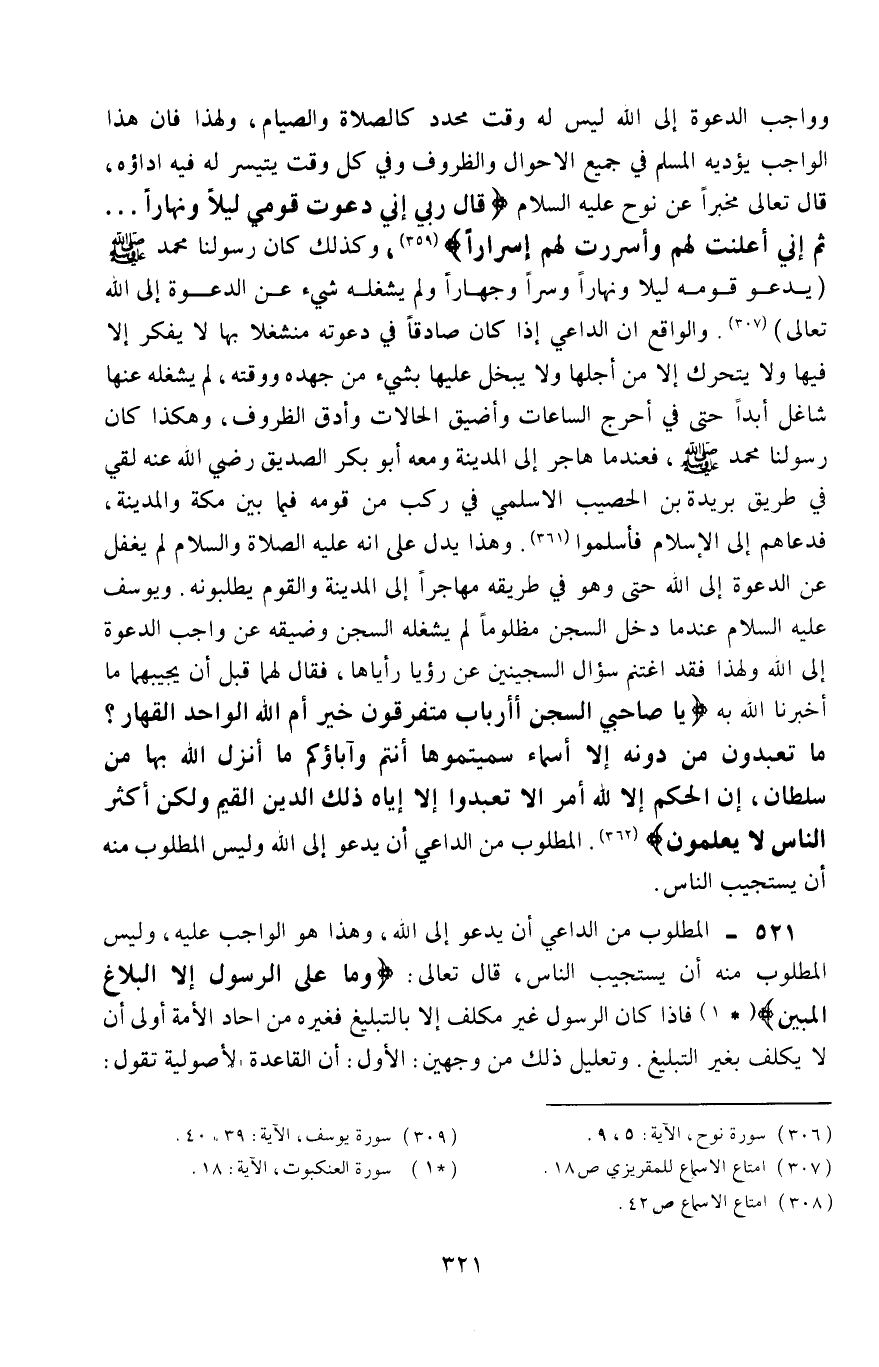 521- المطلوب من الداعي أن يدعو إلى الله، وهذا هو الواجب عليه، وليس المطلوب منه أن يستجيب الناس، قال تعالى: {وَمَا عَلَى الرَّسُولِ إِلَّا الْبَلَاغُ الْمُبِينُ} 4، فإذا كان الرسول غير مكَلَّف إلّا بالتبليغ، فغيره من آحاد الأمَّة أولى أن لا يكلف بغير التبليغ. وتعليل ذلك من وجهين؛ الأول: إنَّ القاعدة الأصولية تقول: