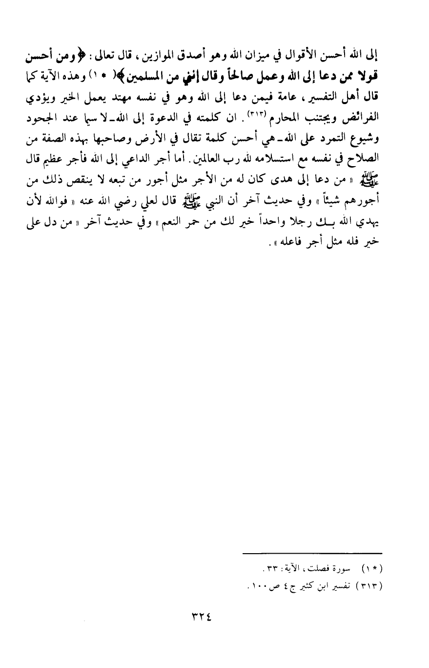 إلى الله أحسن الأقوال في ميزان الله وهو أصدق الموازين، قال تعالى: {وَمَنْ أَحْسَنُ قَوْلًا مِمَّنْ دَعَا إِلَى اللَّهِ وَعَمِلَ صَالِحًا وَقَالَ إِنَّنِي مِنَ الْمُسْلِمِينَ} 1، وهذه الآية كما قال أهل التفسير: عامَّة فيمن دعا إلى الله، وهو في نفسه مهتدٍ يعمل الخير ويؤدي الفرائض ويجتنب المحارم2. إنَّ كلمته في الدعوة إلى الله -لا سيما عند الجحود وشيوع التمرُّد على الله- هي أحسن كلمة تقال في الأرض، وصاحبها بهذه الصفة من الصلاح في نفسه مع استسلامه لله رب العالمين، أمَّا أجر الداعي إلى الله فأجر عظيم، قال -صلى الله عليه وسلم: "من دعا إلى هدًى كان له من الأجر مثل أجور من تبعه، لا ينقص ذلك من أجورهم شيئًا"، وفي حديث آخر أنَّ النبي -صلى الله عليه وسلم- قال لعلي -رضي الله عنه: "فوالله لَأِن يهدي الله بك رجلًا واحدًا خير لك من حُمُر النِّعَم"، وفي حديث آخر: "من دَلَّ على خير فله مثل أجر فاعله".