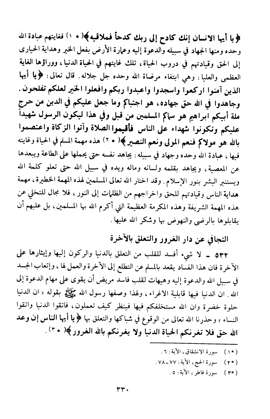 {يَا أَيُّهَا الْإِنْسَانُ إِنَّكَ كَادِحٌ إِلَى رَبِّكَ كَدْحًا فَمُلَاقِيه} 1، فغايتهم عبادة الله وحده، ومنها: الجهاد في سبيله، والدعوة إليه، وعمارة الأرض بفعل الخير، وهداية الحيارى إلى الحق، وقيادتهم في درب الحياة، تلك غايتهم في الحياة الدنيا، ووراؤها الغاية العظمى والعليا، وهي ابتغاء مرضاة الله وحده -جلَّ جلاله. قال تعالى: {يَا أَيُّهَا الَّذِينَ آمَنُوا ارْكَعُوا وَاسْجُدُوا وَاعْبُدُوا رَبَّكُمْ وَافْعَلُوا الْخَيْرَ لَعَلَّكُمْ تُفْلِحُونَ، وَجَاهِدُوا فِي اللَّهِ حَقَّ جِهَادِهِ هُوَ اجْتَبَاكُمْ وَمَا جَعَلَ عَلَيْكُمْ فِي الدِّينِ مِنْ حَرَجٍ مِلَّةَ أَبِيكُمْ إِبْرَاهِيمَ هُوَ سَمَّاكُمُ الْمُسْلِمِينَ مِنْ قَبْلُ وَفِي هَذَا لِيَكُونَ الرَّسُولُ شَهِيدًا عَلَيْكُمْ وَتَكُونُوا شُهَدَاءَ عَلَى النَّاسِ فَأَقِيمُوا الصَّلَاةَ وَآتُوا الزَّكَاةَ وَاعْتَصِمُوا بِاللَّهِ هُوَ مَوْلَاكُمْ فَنِعْمَ الْمَوْلَى وَنِعْمَ النَّصِيرُ} 2، هذه مهمَّة المسلم في الحياة وغايته فيها، عبادة الله وحده، وجهاد في سبيله، يجاهد نفسه حتى يحملها على الطاعة ويبعدها عن المعصية، ويجاهد بقلمه ولسانه وماله ويده في سبيل الله حتى تعلو كلمة الله، ويستنير البشر بنور الإسلام. وقد اختار الله تعالى المسلمين لهذه المهمة الخطيرة، مهمة هداية الناس وقيادتهم للحق، وإخراجهم من الظلمات إلى النور، فلا مجال للتخلي عن هذه المهمة الشريفة، وهذه المكرمة العظيمة التي أكرم الله بها المسلمين، بل عليهم أن يقابلوها بالرضى والنهوض بها، وشكر الله عليها.