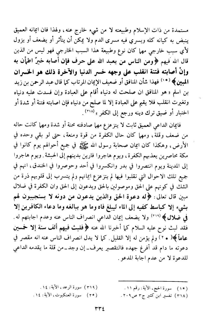مستمدَّة من ذات الإسلام وطبيعته، لا من شيء خارج عنه، ولهذا فإنَّ إيمانه العميق ينبض به كيانه كله، ويسري فيه مسرى الدم، ولا يمكن أن يتأثَّر أو يضعف أو يزول لأيِّ سبب خارجي مهما كان نوع وطبيعة هذا السبب الخارجي، فهو ليس من الذين قال الله فيهم: {وَمِنَ النَّاسِ مَنْ يَعْبُدُ اللَّهَ عَلَى حَرْفٍ فَإِنْ أَصَابَهُ خَيْرٌ اطْمَأَنَّ بِهِ وَإِنْ أَصَابَتْهُ فِتْنَةٌ انْقَلَبَ عَلَى وَجْهِهِ خَسِرَ الدُّنْيَا وَالْآخِرَةَ ذَلِكَ هُوَ الْخُسْرَانُ الْمُبِينُ} 1، فهذا شأن المنافق أو ضعيف الإيمان المرتاب، كما قال عبد الرحمن بن زيد بن أسلم: "هو المنافق، إن صلحت له دنياه أقام على العبادة، وإن فسدت عليه دنياه وتغيرت انقلب فلا يقيم على العبادة إلّا لما صلح من دنياه، فإن أصابته فتنة أو شدة أو اختبار أو ضيق ترك دينه ورجع إلى الكفر"1.