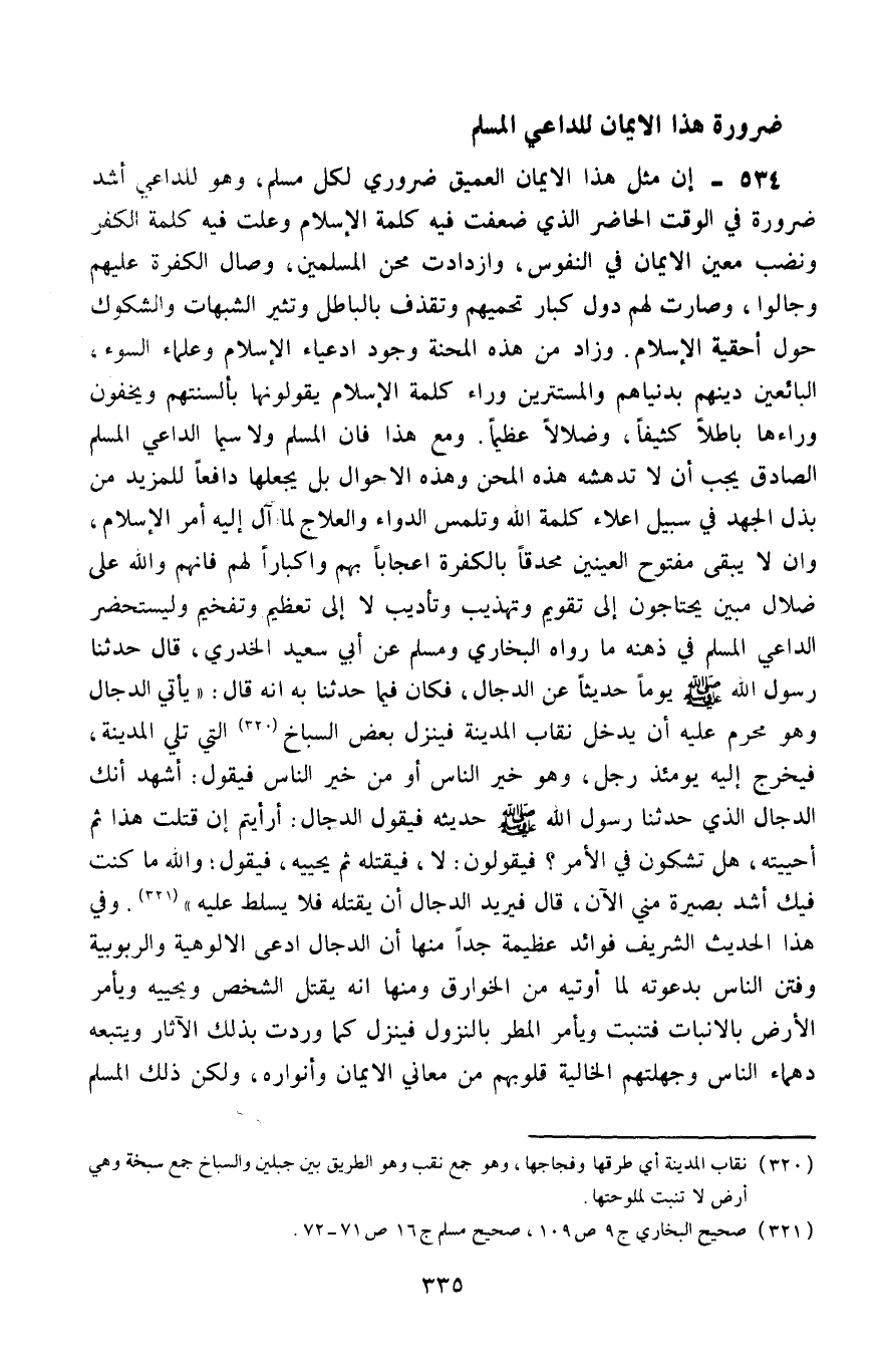 534- إنَّ مثل هذا الإيمان العميق ضروريّ لكل مسلم، وهو للداعي أشد ضرورة في الوقت الحاضر، الذي ضعفت فيه كلمة الإسلام، وعلت فيه كلمة الكفر، ونضب معين الإيمان في النفوس، وازدادت مِحَن المسلمين، وصال الكفرة عليهم وجالوا، وصارت لهم دِوَل كبار تحميهم، وتقذف بالباطل وتثير الشبهات والشكوك حول أحقية الإسلام، وزاد من هذه المحنة وجود أدعياء الإسلام وعلماء السوء البائعين دينهم بدنياهم، والمستترين وراء كلمة الإسلام يقولونها بألسنتهم، ويخفون وراءها باطلًا كثيفًا، وضلالًا عظيمًا، ومع هذا فإنَّ المسلم ولا سيما الداعي المسلم الصادق يجب أن لا تدهشه هذه المحن وهذه الأحوال، بل يجعلها دافعًا للمزيد من بذل الجهد في سبيل إعلاء كلمة الله وتلمُّس الدواء والعلاج لما آل إليه أمر الإسلام، وأن لا يبقى مفتوح العينين محدِّقًا بالكفرة إعجابًا بهم وإكبارًا لهم، فإنهم والله على ضلال مبين، يحتاجون إلى تقويم وتهذيب وتأديب، لا إلى تعظيم وتفخيم، وليستحضر الداعي المسلم في ذهنه ما رواه البخاري ومسلم عن أبي سعيد الخدري، قال: حدثنا رسول الله -صلى الله عليه وسلم- يومًا حديثًا عن الدجَّال، فكان فيما حدثنا به أنه قال: "يأتي الدَّجَّال وهو محرَّم عليه أن يدخل نقاب المدينة، فينزل بعض السباخ 1 التي تلي المدينة، فيخرج إليه يومئذ رجل، وهو خير الناس أو من خير الناس، فيقول: أشهد أنك الدجَّال الذي حدَّثنا رسول الله -صلى الله عليه وسلم- حديثه، فيقول الدجال: أرأيتم إن قتلت هذا ثم أحييته، هل تشكّون في الأمر؟ فيقولون: لا، فيقلته ثم يحييه، فيقول: والله ما كنت فيك أشدّ بصيرة مني الآن، قال: فيريد الدجال أن يقتله فلا يسلط عليه" 2، وفي هذا الحديث الشريف فوائد عظيمة جدًّا، منها: أنَّ الدجال ادَّعى الألوهية والربوبية، وفتن الناس بدعوته لِمَا أوتيه من الخوارق، ومنها أنَّه يقتل الشخص ويحييه، ويأمر الأرض بالإنبات فتنبت، ويأمر المطر بالنزول فينزل، كما وردت بذلك الآثار، ويتبعه دهماء الناس وجهلتهم الخالية قلوبهم من معاني الإيمان وأنواره، ولكنّ ذلك المسلم