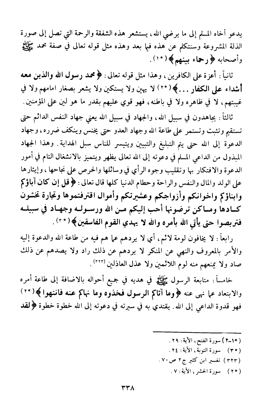 ثالثًا: يجاهدون في سبيل الله، والجهاد في سبيل الله يعني: جهاد النفس الدائم حتى تستقيم وتثبت وتستمر على طاعة الله، وجهاد العدو حتى يخنس وينكف ضرره، وجهاد الدعوة إلى الله حتى يتمَّ التبليغ والتبيين ويتيسَّر للناس سبل الهداية، وهذا الجهاد المبذول من الداعي المسلم في دعوته إلى الله تعالى يظهر ويتميز بالانشغال التامّ في أمور الدعوة والافتكار بها، وتقليب وجوه الرأي في وسائلها، والحرص على نجاحها، وإيثارها على الولد والمال والنفس والراحة وحطام الدنيا كلها، قال تعالى: {قُلْ إِنْ كَانَ آبَاؤُكُمْ وَأَبْنَاؤُكُمْ وَإِخْوَانُكُمْ وَأَزْوَاجُكُمْ وَعَشِيرَتُكُمْ وَأَمْوَالٌ اقْتَرَفْتُمُوهَا وَتِجَارَةٌ تَخْشَوْنَ كَسَادَهَا وَمَسَاكِنُ تَرْضَوْنَهَا أَحَبَّ إِلَيْكُمْ مِنَ اللَّهِ وَرَسُولِهِ وَجِهَادٍ فِي سَبِيلِهِ فَتَرَبَّصُوا حَتَّى يَأْتِيَ اللَّهُ بِأَمْرِهِ وَاللَّهُ لَا يَهْدِي الْقَوْمَ الْفَاسِقِينَ} 2.