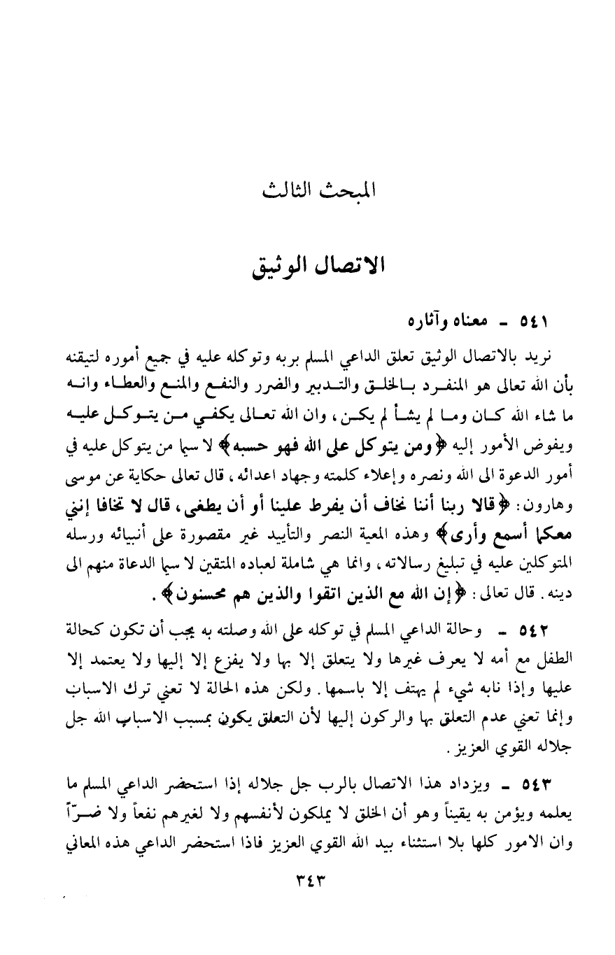 542- وحالة الداعي المسلم في توكله على الله وصلته به يجب أن تكون كحالة الطفل مع أمه، لا يعرف غيرها، ولا يتعلق إلّا بها، ولا يفزع إلّا إليها، ولا يعتمد إلّا عليها، وإذا نابه شيء لم يهتف إلّا باسمها، ولكن هذه الحالة لا تعني ترك الأسباب وإنما تعني عدم التعلق بها والركون إليها؛ لأن التعلق يكون بمسبِّب الأسباب الله -جل جلاله- القوي العزيز.