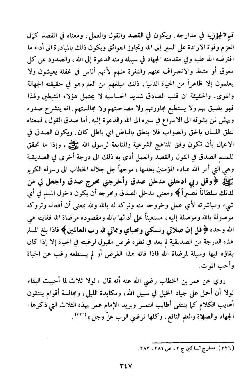 قيم الجوزية في مدارجه، ويكون في القصد والقول والعمل، ومعناه في القصد: كمال العزم وقوة الإرادة على السير إلى الله وتجاوز العوائق، ويكون ذلك بالمبادرة إلى أداء ما افتراضه الله عليه، وفي مقدمته الجهاد في سبيله، ومنه: الدعوة إلى الله، والصدود عن كل معوّق أو مثبِّط، والانصراف عنهم والنفرة منهم؛ لأنهم أناس في غفلة يعيشون، ولا يعلمون إلّا ظاهرًا من الحياة الدنيا، ذلك مبلغهم من العلم، وهو في حقيقته الجهالة والهوى. والحقيقة أنَّ قلب الصادق شديد الحساسية لا يحتمل هؤلاء المثبطين، ولهذا فهو يضيق بهم، ولا يستطيع مجاورتهم ولا مصاحبتهم ولا مجالستهم، إنَّه ينشرح صدره ويهِشُّ لمن يشوقه إلى الإسراع في سيره إلى الله والدعوة إليه، أمَّا صدق القول فمعناه: نطق اللسان بالحق والصواب فلا ينطق بالباطل، أيّ باطلٍ كان، ويكون الصدق في الأعمال بأن تكون وفق المناهج الشرعية والمتابعة لرسول الله -صلى الله عليه وسلم، وإذا ما تحقَّق للمسلم الصدق في القول والقصد والعمل أدَّى به ذلك إلى درجةٍ أخرى في الصديقية، وهي التي أمر الله عباده المؤمنين بطلبها، موجِّهًا -جلَّ جلاله- الخطاب إلى رسوله الكريم -صلى الله عليه وسلم: {وَقُلْ رَبِّ أَدْخِلْنِي مُدْخَلَ صِدْقٍ وَأَخْرِجْنِي مُخْرَجَ صِدْقٍ وَاجْعَلْ لِي مِنْ لَدُنْكَ سُلْطَانًا نَصِيرًا} ومعنى مدخل الصدق ومخرجه أن يكون دخول المسلم في أي شيء، ومباشرته لأيِّ عمل، وخروجه منه وتركه له بالله ولله، بمعنى أنَّ أفعاله وتروكه موصولة بالله وموصولة إليه، مستعينًا على أدائها بالله، ومقصوده مرضاة الله، فغايته هي الله وحده {قُلْ إِنَّ صَلاتِي وَنُسُكِي وَمَحْيَايَ وَمَمَاتِي لِلَّهِ رَبِّ الْعَالَمِينَ} ، فإذا بلغ المسلم هذه الدرجة من الصديقية لم يعد في نظره غرض مقبول لرغبته في الحياة إلّا إذا كان بقاؤه فيها وسيلة لمرضاة الله، فإذا فاته هذا الغرض أو لم يستطعه رَغِب عن الحياة وأحبَّ الموت.