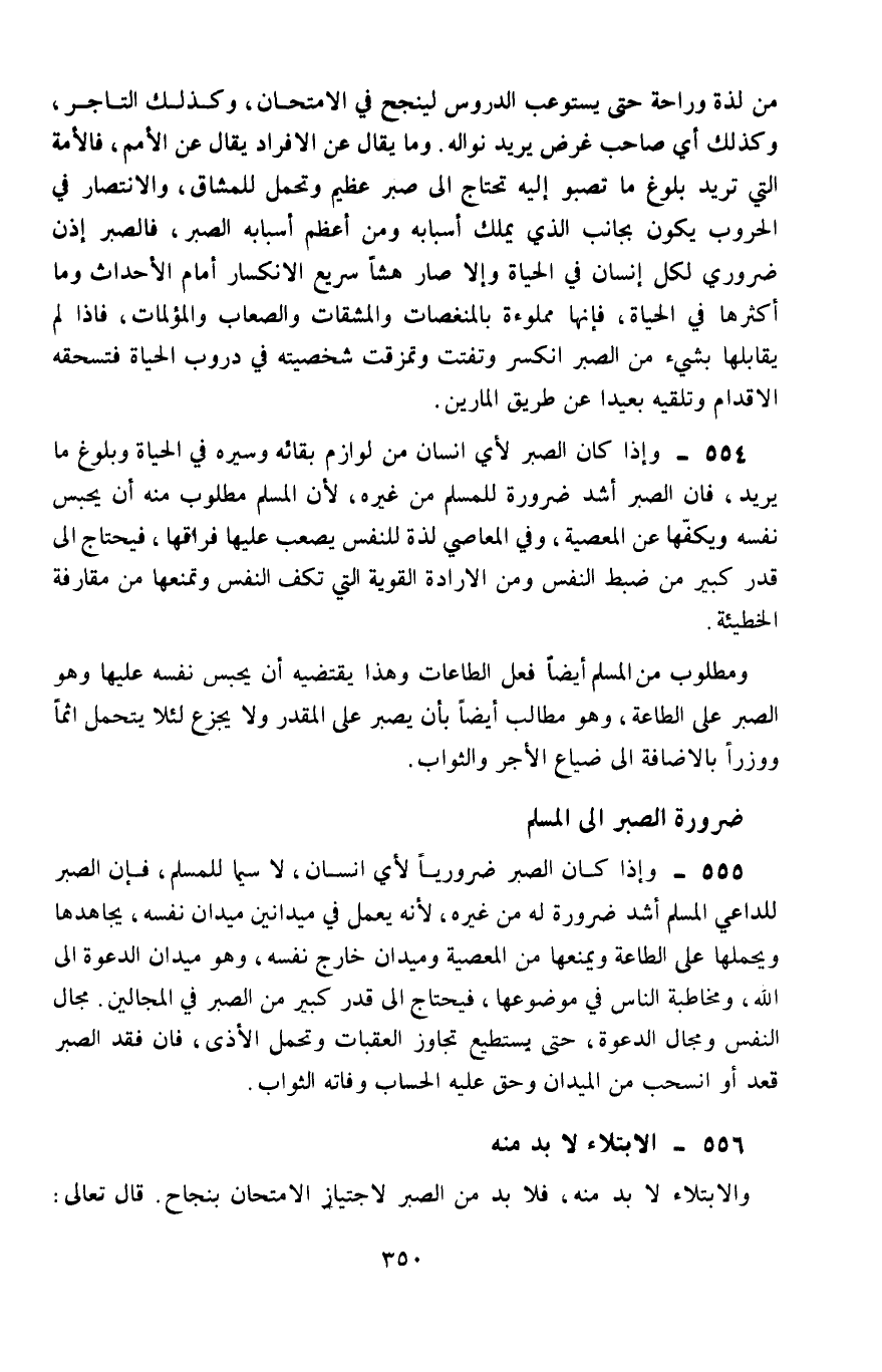 554- وإذا كان الصبر لأيِّ إنسانٍ من لوازم بقائه وسيره في الحياة وبلوغ ما يريد، فإنَّ الصبر أشدَّ ضرورة للمسلم من غيره؛ لأنَّ المسلم مطلوب منه أن يحبس نفسه ويكفّها عن المعصية، وفي المعاصي لذة للنفس يصعب عليها فراقها، فيحتاج إلى قدر كبير من ضبط النفس ومن الإرادة القوية التي تكفّ النفس وتمنعها من مقارفة الخطئية.