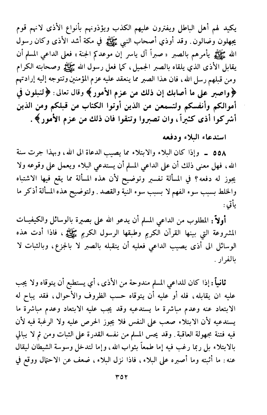 558- وإذا كان البلاء والابتلاء مما يصيب الدعاة إلى الله، وبهذا جرت سنة الله، فهل معنى ذلك أنَّ على الداعي المسلم أن يستدعي البلاء ويعمل على وقوعه، ولا يجوز له دفعه؟ في المسألة تفسير وتوضيح؛ لأنَّ هذه المسألة مما يقع فيها الاشتباه والخلط بسبب سوء الفهم، لا بسبب سوء النية والقصد، ولتوضيح هذه المسألة أذكر ما يأتي: