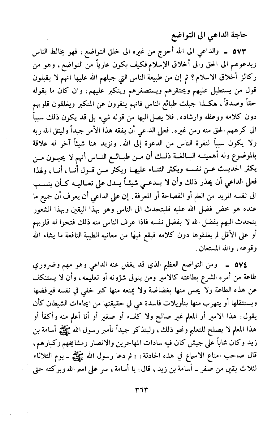 574- ومن التواضع العظيم الذي قد يغفل عنه الداعي وهو مهم وضروري طاعة من أمره الشرع بطاعته، كالأمير ومن يتولى شئونه أو تعليمه، وأن لا يستنكف عن هذه الطاعة، ولا يحس منها بغضاضة، ولا يمنعه منها كِبْرٌ خفي في نفسه، فيرفضها ويستثقلها، أو يتهرب منها بتأويلاتٍ فاسدة، هي في حقيقتها من إيحاءات الشيطان، كأن يقول: هذا الأمير أو المعلم غير صالح ولا كفء أو صغيرًا، أو أنا أعلم منه وأكفأ، أو هذا المعلم لا يصلح للتعليم ونحو ذلك، وليتذكَّر جيدًا تأمير رسول الله -صلى الله عليه وسلم- أسامة بن زيد وكان شابًّ على جيش كان فيه سادات المهاجرين والأنصار ومشايخهم وكبارهم، قال صاحب "إمتاع الأسماع" في هذه الحادثة: "ثم دعا رسول الله -صلى الله عليه وسلم، يوم الثلاثاء لثلاث بقين من صفر- أسامة بن زيد، قال: يا أسامة، سِرْ على اسم الله وبركته حتى