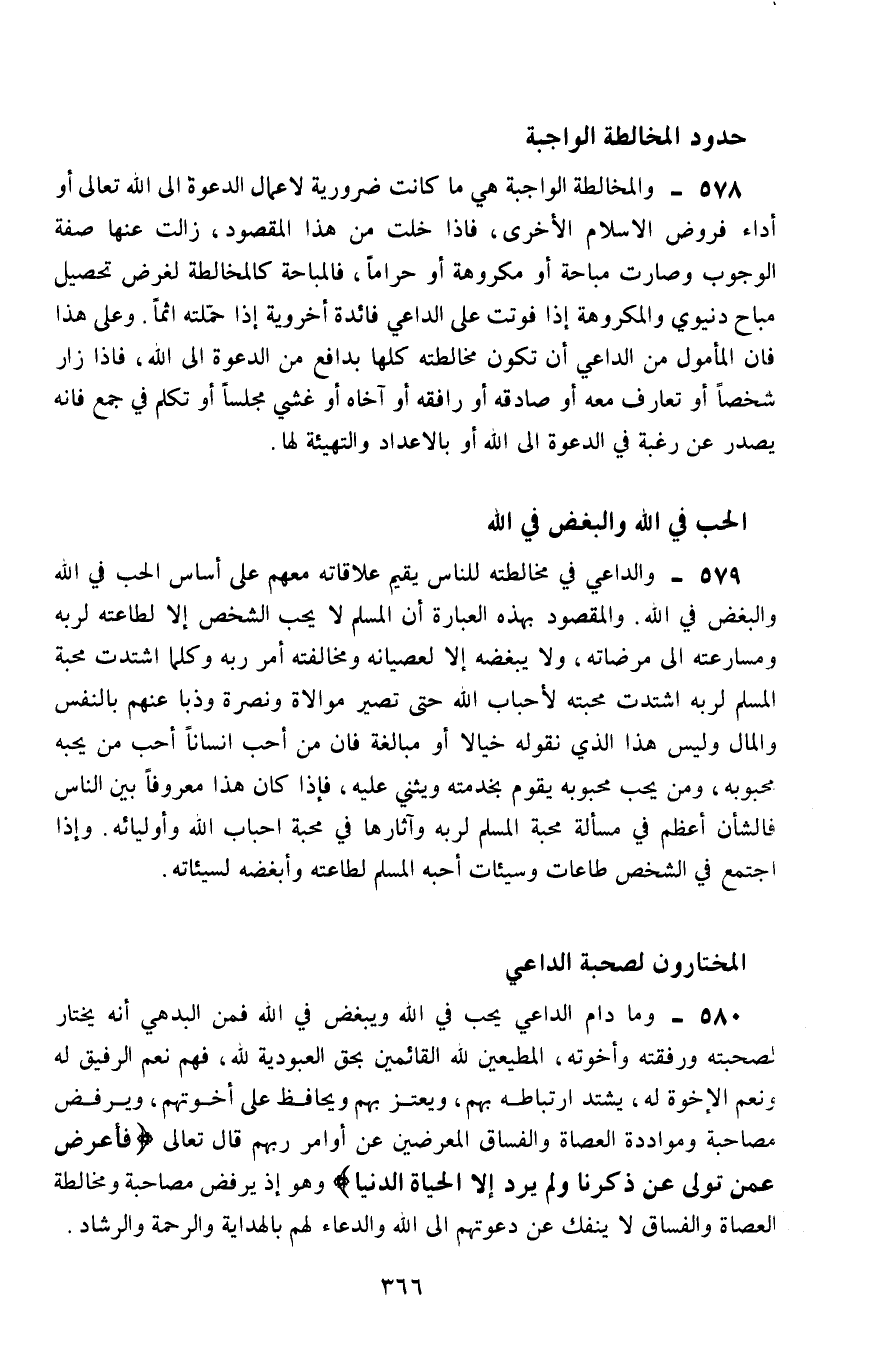 579- والداعي في مخالطته يقيم علاقاته معهم على أساس الحب في الله والبغض في الله، والمقصود بهذه العبارة أنَّ المسلم لا يحب الشخص إلّا لطاعته لربه، ومسارعته إلى مرضاته، ولا يبغضه إلّا لعصيانه ومخالفته أمر ربه، وكلما اشتدت محبَّة المسلم لربِّه اشتدت محبته لأحباب الله، حتى تصير موالاة ونصرة وذَبًّا عنهم بالنفس والمال، وليس هذا الذي نقوله خيالًا أو مبالغة، فإنَّ مَنْ أحبَّ إنسانًا أحبَّ من يحبه محبوبه، ومن يحب محبوبه يقوم بخدمته ويثني عليه، فإذا كان هذا معروفًا بين الناس فالشأن أعظم في مسالة محبَّة المسلم لربه، وآثارها في محبة أحباب الله وأوليائه، وإذا اجتمع في الشخص طاعات وسيئات أحبه المسلم لطاعته وأبغضه لسيئاته.