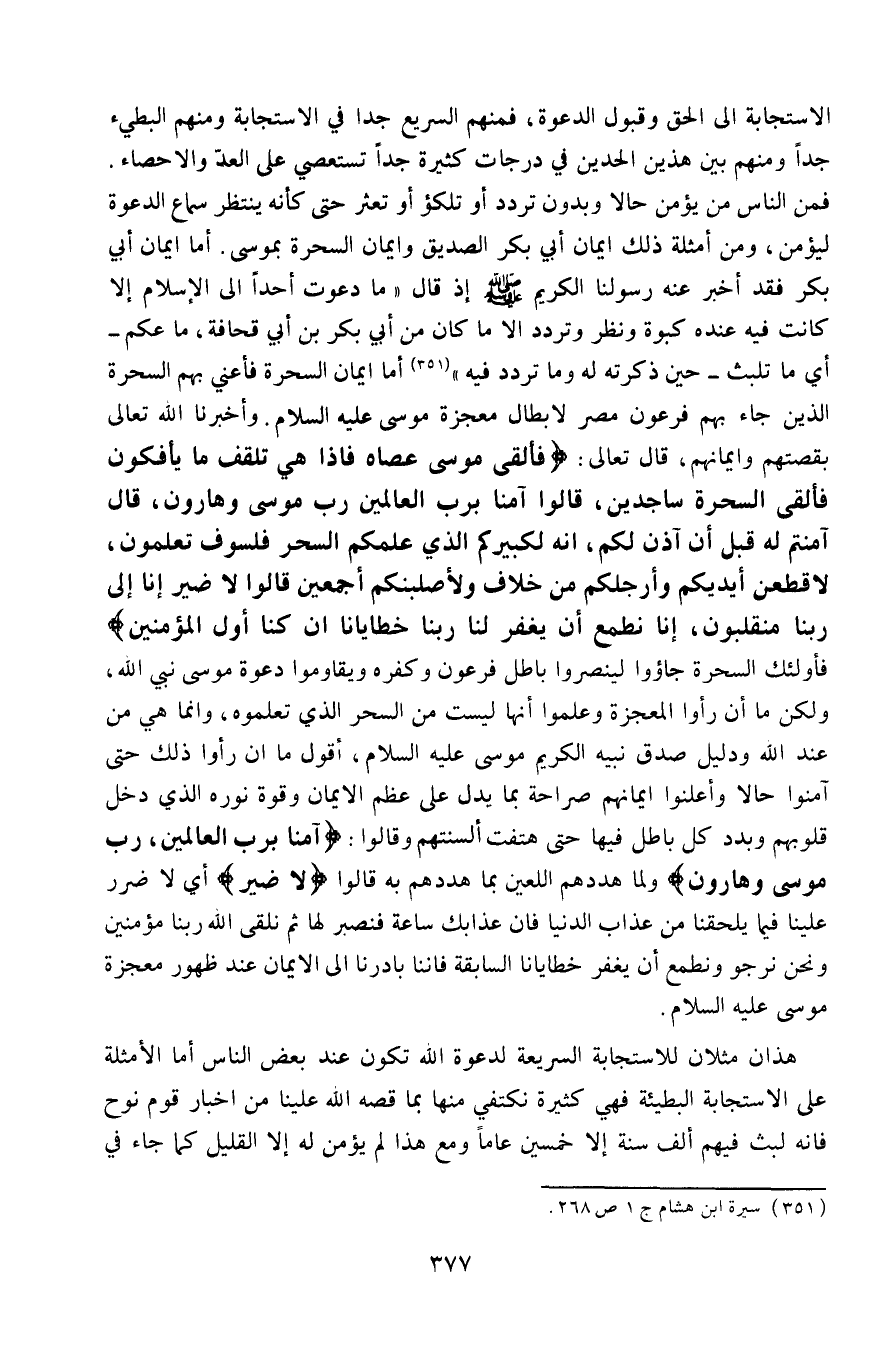الاستجابة إلى الحق وقبول الدعوة، فمنهم السريع جدًّا في الاستجابة، ومنهم البطيء جدًّا، ومنهم بين هذين الحدَّين في درجات كثيرة جدًّا تستعصي على العدِّ والإحصاء، فمن الناس من يؤمن حالًا وبدون تردد أو تلكؤ أو تعثر، حتى كأنه ينتظر سماع الدعوة ليؤمن، ومن أمثلة ذلك إيمان أبي بكر الصديق وإيمان السحرة بموسى، أمَّا إيمان أبي بكر فقد أخبر عنه رسولنا الكريم -صلى الله عليه وسلم؛ إذ قال: "ما دعوت أحدًا إلى الإسلام إلّا كانت فيه عنده كبوة ونظرة وتردد، إلّا ما كان من أبي بكر بن أبي قحافة، ما عكم -أي: ما تلبَّث- حين ذكرته له وما تردد فيه" 1، أمَّا إيمان السحرة فأعني بهم السحرة الذين جاء بهم فرعون مصر لإبطال معجزة موسى -عليه السلام، وأخبرنا الله تعالى بقصتهم وإيمانهم، قال تعالى: {فَأَلْقَى مُوسَى عَصَاهُ فَإِذَا هِيَ تَلْقَفُ مَا يَأْفِكُونَ، فَأُلْقِيَ السَّحَرَةُ سَاجِدِينَ، قَالُوا آمَنَّا بِرَبِّ الْعَالَمِينَ، رَبِّ مُوسَى وَهَارُونَ، قَالَ آمَنْتُمْ لَهُ قَبْلَ أَنْ آذَنَ لَكُمْ إِنَّهُ لَكَبِيرُكُمُ الَّذِي عَلَّمَكُمُ السِّحْرَ فَلَسَوْفَ تَعْلَمُونَ لَأُقَطِّعَنَّ أَيْدِيَكُمْ وَأَرْجُلَكُمْ مِنْ خِلَافٍ وَلَأُصَلِّبَنَّكُمْ أَجْمَعِينَ، قَالُوا لَا ضَيْرَ إِنَّا إِلَى رَبِّنَا مُنْقَلِبُونَ، إِنَّا نَطْمَعُ أَنْ يَغْفِرَ لَنَا رَبُّنَا خَطَايَانَا أَنْ كُنَّا أَوَّلَ الْمُؤْمِنِينَ} ، فأولئك السحرة جاءوا لينصروا باطل فرعون وكفره، ويقاوموا دعوة موسى نبي الله، ولكن ما إن رأوا المعجزة وعلموا أنَّها ليست من السحر الذي تعلَّموه، وإنَّما هي من عند الله، ودليل صدق نبيه الكريم موسى -عليه السلام، أقول: ما إن رأوا ذلك حتى آمنوا حالًا وأعلنوا إيمانهم صراحة، بما يدل على عِظَم الإيمان، وقوة نوره الذي دخل قلوبهم وبدَّد كل باطل فيها، حتى هتفت ألسنتهم وقالوا: {آمَنَّا بِرَبِّ الْعَالَمِينَ، رَبِّ مُوسَى وَهَارُونَ} ، ولمَّا هدَّدَهم اللعين بما هدَّدَهم به قالوا: {لَا ضَيْر} ، أي: لا ضرر علينا فيما يلحقنا من عذاب الدنيا، فإن عذابك ساعة فنصبر لها، ثم نلقى الله ربنا مؤمنين، ونحن نرجوا ونطمع أن يغفر خطايانا السابقة، فإنَّنَا بادرنا إلى الإيمان عند ظهور معجزة موسى -عليه السلام.
