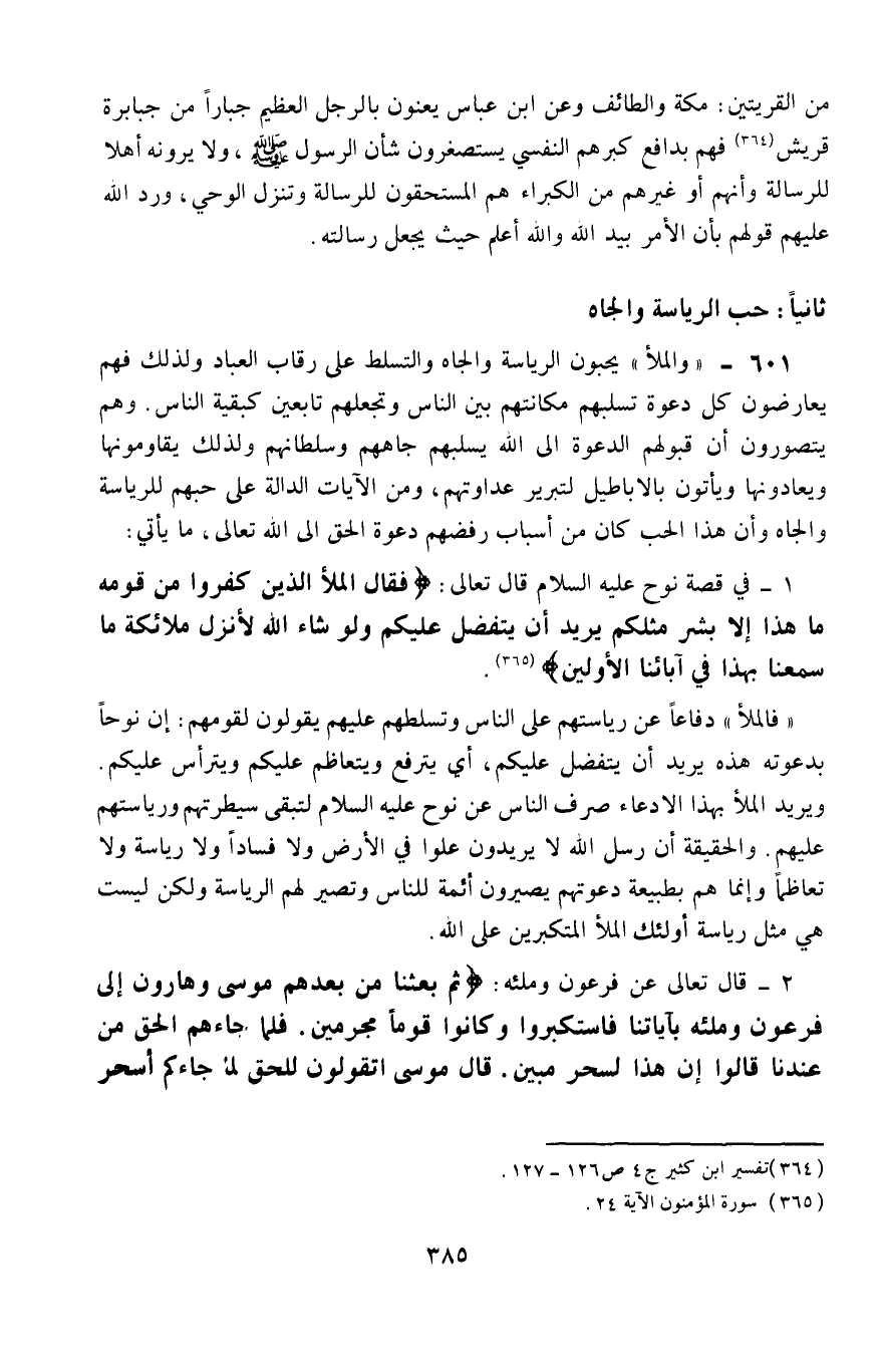 601- "والملأ" يحبون الرياسة والجاه والتسلط على رقاب العباد، ولذلك فهم يعارضون كل دعوة تسلبهم مكانتهم بين الناس وتجعلهم تابعين كبقية الناس، وهم يتصوَّرون أنَّ قبولهم الدعوة إلى الله يسلبهم جاههم وسلطانهم، ولذلك يقاومونها ويعادونها ويأتون بالأباطيل لتبرير عداوتهم، ومن الآيات الدالة على حبهم للرياسة والجاه، وأنَّ هذ الحب كان من أسباب رفضهم دعوة الحق إلى الله تعالى، ما يأتي: