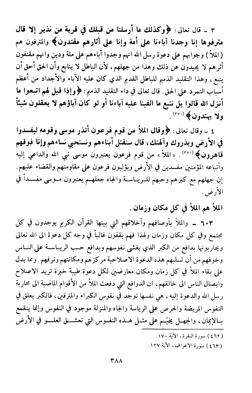 603- والملا بأوصافهم وأخلاقهم التي بيَّنَها القرآن الكريم يوجدون في كل مجتمع، وفي كل مكان وزمان، ولهذا فهم يقفون غالبًا في وجه كل دعوة إلى الله تعالى، ويحاربونها بدافعٍ من الكبر الذي يغشى نفوسهم، وبدافع حب الرياسة على الناس، وخوفهم من أن تسلبهم هذه الدعوة الإصلاحية مركزهم ومكانتهم وترفهم، ومما يدل على بقاء الملأ في كل زمان ومكان معارضين لكل دعوة طيبة خيرة تريد الإصلاح وإيصال الناس إلى خالقهم، إنَّ الدوافع التي دفعت الملأ من الأقوام الماضية إلى محاربة رسل الله والدعوة إليه، هي نفسها توجد في نفوس الكبراء والمترفين، فالكبر يعلق في النفوس المريضة والحرص على الرياسة والجاه والمنزلة، موجود في النفوس، وإنما ينقمع بالإيمان، والجهل يخيِّم على مثل هذه النفوس التي تعشق العلوَّ في الأرض