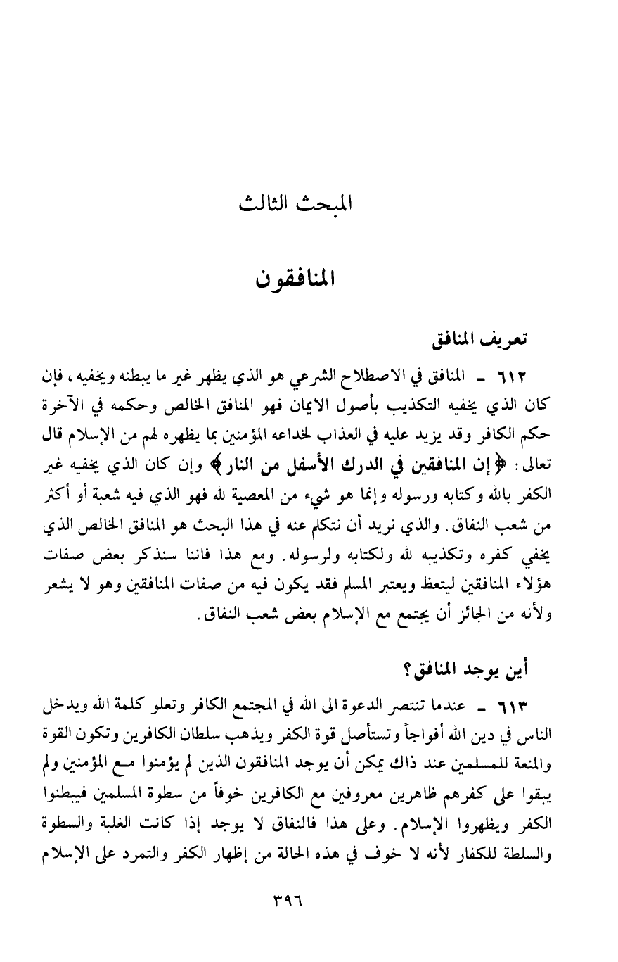 612- المنافق في الاصطلاح الشرعي: هو الذي يظهر غير ما يبطنه ويخفيه، فإن كان الذي يخفيه التكذيب بأصول الإيمان فهو المنافق الخالص، وحكمه في الآخرة حكم الكافر، وقد يزيد عليه في العذاب لخداعه المؤمنين بما يظهره لهم من الإسلام، قال تعالى: {إِنَّ الْمُنَافِقِينَ فِي الدَّرْكِ الأَسْفَلِ مِنَ النَّارِ} ، وإن كان الذي يخفيه غير الكفر بالله وكتابه ورسوله، وإنما هو شيء من المعصية لله، فهو الذي فيه شعبة أو أكثر من شعب النفاق، والذي نريد أن نتكلم عنه في هذا البحث هو المنافق الخالص الذي يخفي كفره وتكذيبه لله ولكتابه ولرسوله، ومع هذا فإنَّنَا سنذكر بعض صفات هؤلاء المنافقين ليتَّعِظَ ويعتبر المسلم، فقد يكون فيه من صفات المنافقين وهو لا يشعر؛ ولأنه من الجائز أن يجتمع مع الإسلام بعض شعب النفاق.
