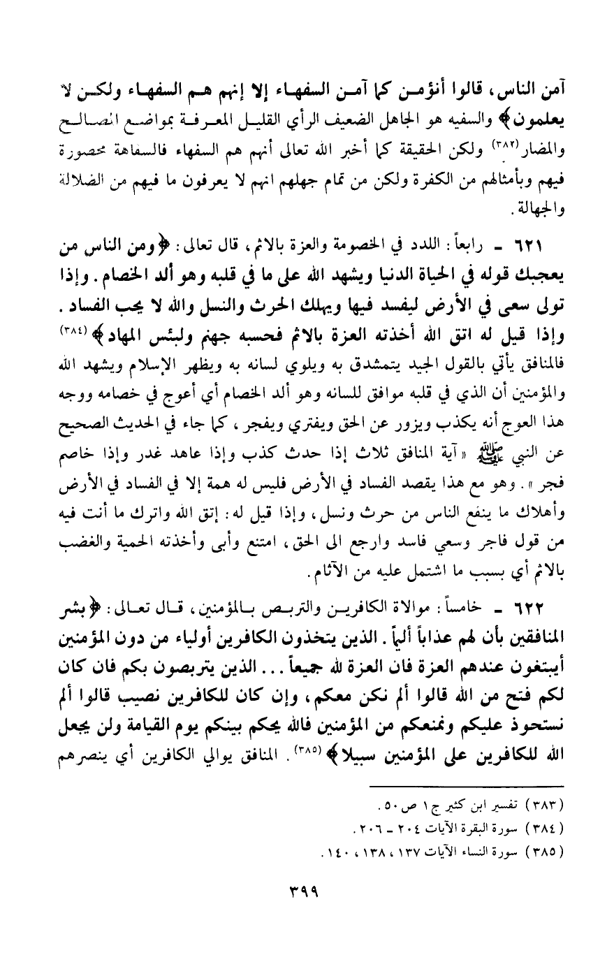 621- رابعًا: اللدد في الخصومة والعزة بالإثم، قال تعالى: {وَمِنَ النَّاسِ مَنْ يُعْجِبُكَ قَوْلُهُ فِي الْحَيَاةِ الدُّنْيَا وَيُشْهِدُ اللَّهَ عَلَى مَا فِي قَلْبِهِ وَهُوَ أَلَدُّ الْخِصَامِ، وَإِذَا تَوَلَّى سَعَى فِي الْأَرْضِ لِيُفْسِدَ فِيهَا وَيُهْلِكَ الْحَرْثَ وَالنَّسْلَ وَاللَّهُ لَا يُحِبُّ الْفَسَادَ، وَإِذَا قِيلَ لَهُ اتَّقِ اللَّهَ أَخَذَتْهُ الْعِزَّةُ بِالْإِثْمِ فَحَسْبُهُ جَهَنَّمُ وَلَبِئْسَ الْمِهَادُ} 2، فالمنافق يأتي بالقول الجيد يتشدَّق به ويلوي لسانه به، ويظهر الإسلام، ويشهد الله والمؤمنين أنَّ الذي في قلبه موافق للسانه وهو ألدّ الخصام، أي: أعوج في خصامه، ووجه هذا العوج أنَّه يكذب ويزوّر عن الحق ويفتري ويفجر، كما جاء في الحديث الصحيح عن النبي -صلى الله عليه وسلم: "آية المنافق ثلاث: إذا حدَّث كذب، وإذا عاهد غدر، وإذا خاصم فجر"، وهو مع هذا يقصد الفساد في الأرض، فليس له هِمَّة إلّا في الفساد في الأرض وإهلاك ما ينفع الناس من حرثٍ ونسل، وإذا قيل له: اتق الله واترك ما أنت فيه من قول فاجر وسعي فاسد، وارجع إلى الحق، امتنع وأبى وأخذته الحميَّة والغضب بالأثم، أي: بسبب ما اشتمل عليه من الآثام.