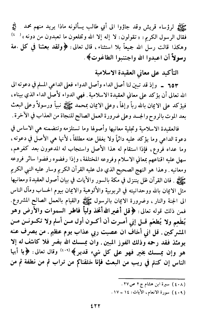653- وإذ قد تبيِّنَ لنا أصل الداء وأصل الدواء، فعلى الداعي المسلم في دعوته إلى الله تعالى أن يؤكِّد على معاني العقيدة الإسلامية، فهي الدواء لأصل الداء الذي بيناه، فيؤكد على الإيمان بالله ربًّا وإلهًا، وعلى الإيمان بمحمد -صلى الله عليه وسلم- نبيًّا ورسولًا، وعلى البعث بعد الموت بالروح والجسد، وعلى ضرورة العمل الصالح للنجاة من العذاب في الآخرة.