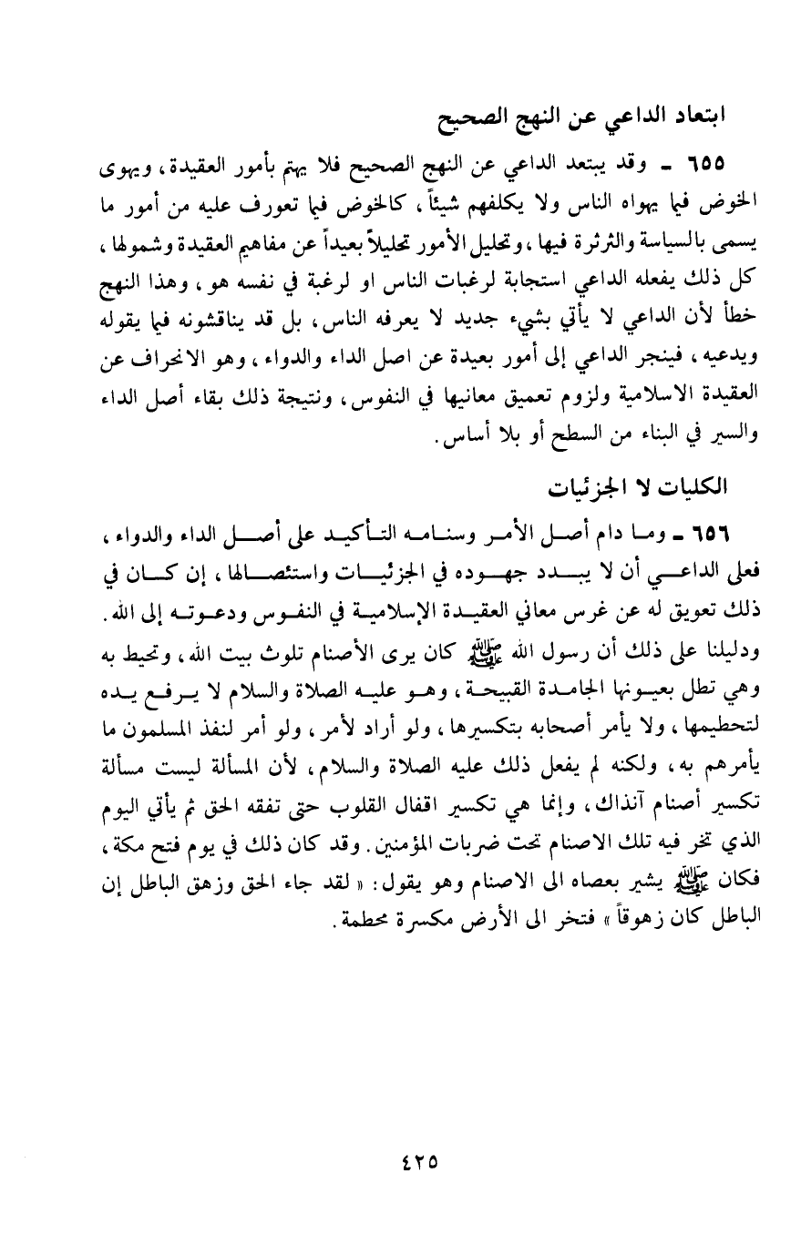 656- وما دام أصل الأمر وسنامه التأكيد على أصل الداء والدواء، فعلى الداعي أن لا يبدِّد جهوده في الجزئيات واستئصالها إن كان في ذلك تعويق له عن غرس معاني العقيدة الإسلامية في النفوس، ودعوته إلى الله.