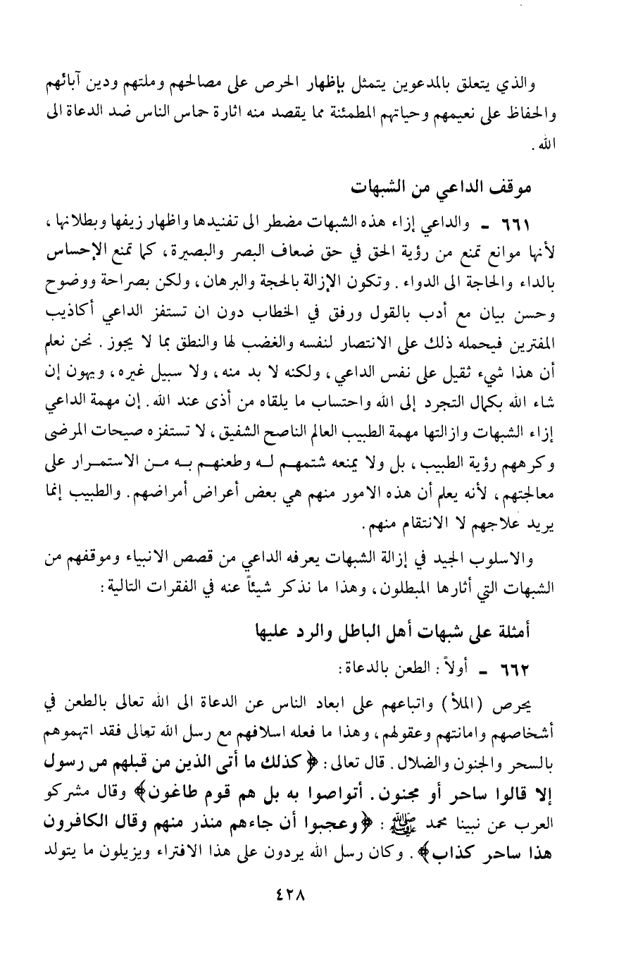 661- والداعي إزاء هذه الشبهات مضطر إلى تنفيذها وإظهار زيفها وبطلانها؛ لأنها موانع تمنع من رؤية الحق في حق ضعاف البصر والبصيرة، كما تمنع الإحساس بالداء، والحاجة إلى الدواء، وتكون الإزالة بالحجة والبرهان، ولكن بصراحة ووضح وحسن بيان، مع أدبٍ بالقول ورفقٍ في الخطاب، دون أن تستفز الداعي أكاذيب المفترين، فيحمله ذلك على الانتصار لنفسه والغضب لها، والنطق بما لا يجوز. نحن نعلم أنَّ هذا شيء ثقيل على نفس الداعي، ولكنه لا بُدَّ منه، ولا سبيل غيره، ويهون إن شاء الله بكمال التجرُّد إلى الله، واحتساب ما يلقاه من أذى عند الله. إنَّ مهمة الداعي إزاء الشبهات وإزالتها مهمة الطبيب العالم الناصح الشفيق، لا تسنفزه صيحات المرضى وكرههم رؤية الطبيب، بل ولا يمنعه شتمهم له وطعنهم به من الاستمرار على معالجتهم؛ لأنه يعلم أنَّ هذه الأمور منهم هي بعض أعراض أمراضهم، والطيب إنما يريد علاجهم لا الانتقام منهم.