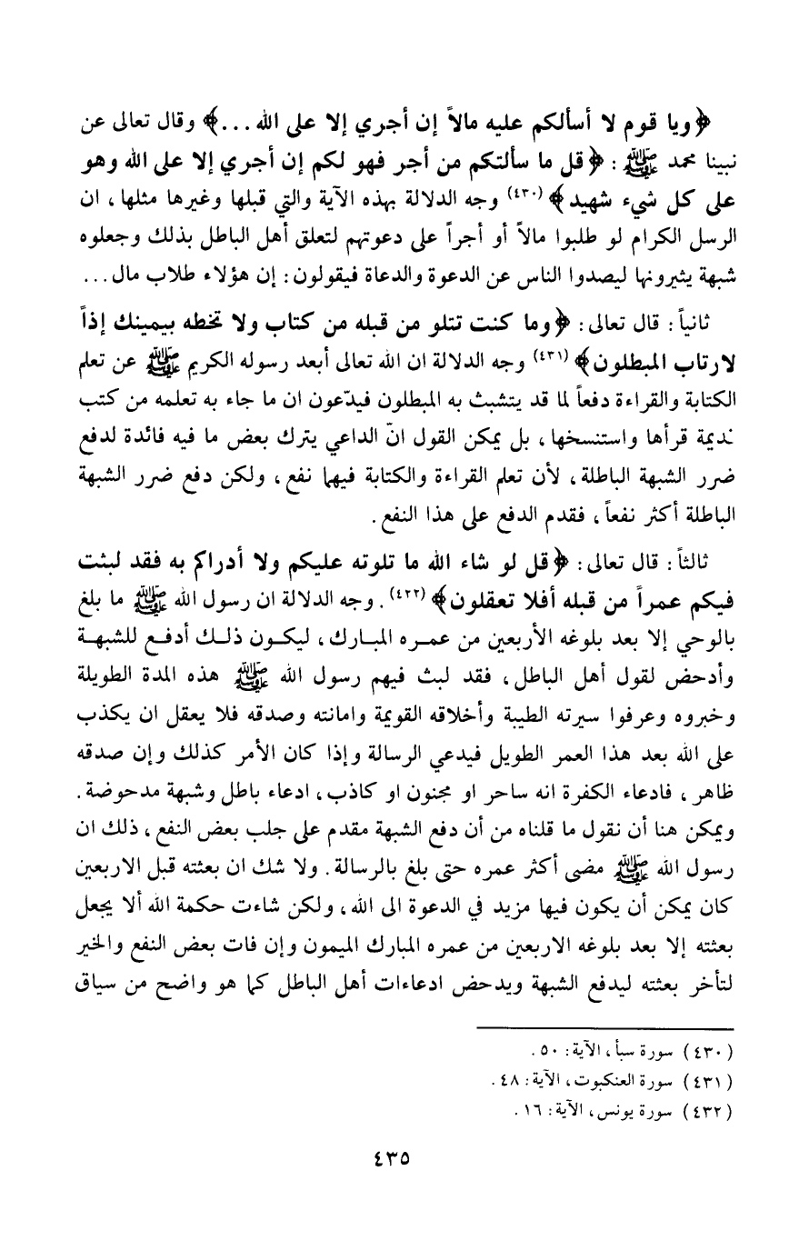 ثالثًا: قال تعالى: {قُلْ لَوْ شَاءَ اللَّهُ مَا تَلَوْتُهُ عَلَيْكُمْ وَلَا أَدْرَاكُمْ بِهِ فَقَدْ لَبِثْتُ فِيكُمْ عُمُرًا مِنْ قَبْلِهِ أَفَلَا تَعْقِلُونَ} 3، وجه الدلالة أن رسول الله -صلى الله عليه وسلم- ما بلغ بالوحي إلّا بعد بلوغه الأربعين من عمره المبارك؛ ليكون ذلك أدفع للشبهة وأدحض لقول أهل الباطل، فقد لبث فيهم رسول الله -صلى الله عليه وسلم- هذه المدة الطويلة وخبروه وعرفوا سيرته الطيبة وأخلاقه القويمة وأمانته وصدقه، فلا يعقل أن يكذِب على الله بعد هذا العمر الطويل فيدعي الرسالة، وإذا كان الأمر كذلك وإن صدقه ظاهر، فادّعاء الكفرة أنه ساحر أو مجنون أو كاذب ادعاء باطل وشبهة مدحوضة.