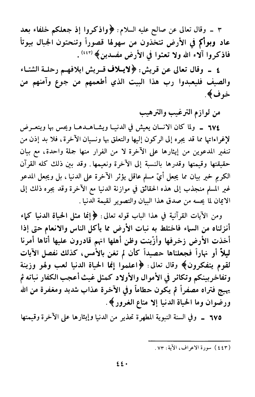 674- ولما كان الإنسان يعيش في الدنيا ويشاهدها ويحسّ بها ويتعرَّض لإغراءاتها، مما قد يجره إلى الركون إليه والتعلق بها ونسيان الآخرة، فلا بُدَّ إذن من تنفير المدعوين من إيثارها على الآخرة، لا من الفرار منها جملة واحدة، مع بيان حقيقتها وقيمتها وقدرها بالنسبة إلى الآخرة ونعيمها، وقد بَيِّنَ ذلك كله القرآن الكريم خير بيان، مما يجعل أيّ مسلم عاقل يؤثر الآخرة على الدنيا، بل ويجعل المدعوَّ غير المسلم منجذب إلى هذه الحقائق في موازنة الدنيا مع الآخرة، وقد يجره ذلك إلى الإيمان لما يحسه من صدق هذا البيان والتصوير لقيمة الدنيا.