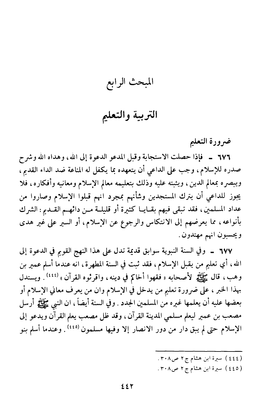 677- وفي السُّنَّة النبوية سوابق قديمة تدل على هذا المنهج القويم في الدعوة إلى الله، أي: تعليم من يقبل الإسلام، فقد ثبت في السنة المطهرة أنه عندما أسلم عُمَيْر بن وهب، قال -صلى الله عليه وسلم- لأصحابه: "فقِّهوا أخاكم في دينه، وأقرئوه القرآن" 1، ويستدل بهذا الخبر على ضرورة تعليم من يدخل في الإسلام، وأن من يعرف معاني الإسلام أو بعضها عليه أن يعلمها غيره من المسلمين الجدد، وفي السنة أيضًا، أنَّ النبي -صلى الله عليه وسلّم- أرسل مصعب بن عمير ليعلِّم مسلمي المدينة القرآن، وقد ظلَّ مصعب يعلِّم القرآن ويدعو إلى الإسلام حتى لم يبق دار من دور الأنصار إلّا وفيها مسلمون2. وعندما أسلم بنو