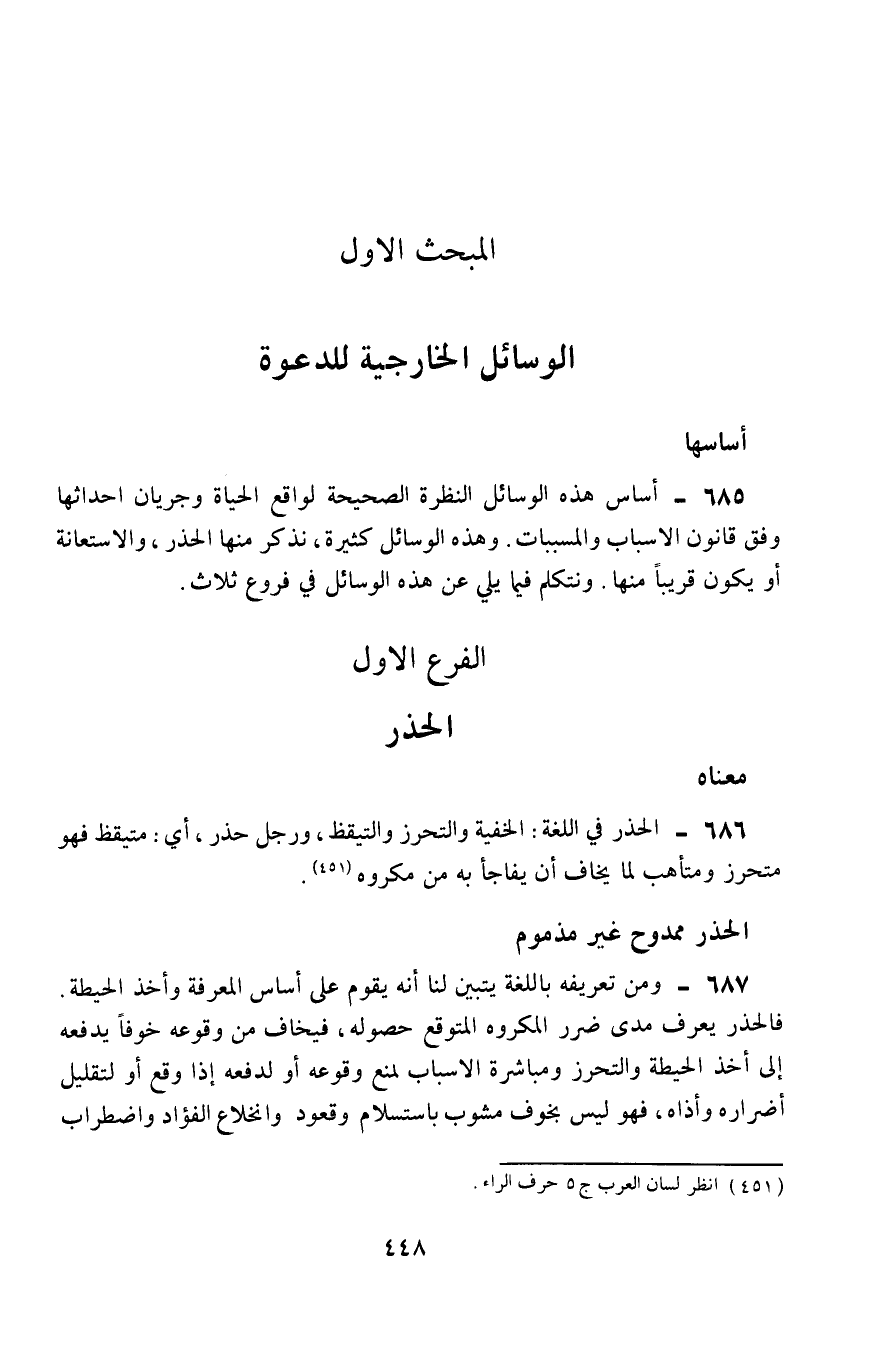 685- أساس هذه الوسائل النظرة الصحيحة لواقع الحياة وجريان أحداثها وفق قانون الأسباب والمسببات، وهذه الوسائل كثيرة، نذكر منها: الحذر، والاستعانة، أو يكون قريبًا منها، ونتكلم فيما يلي عن هذه الوسائل في فروع ثلاث: