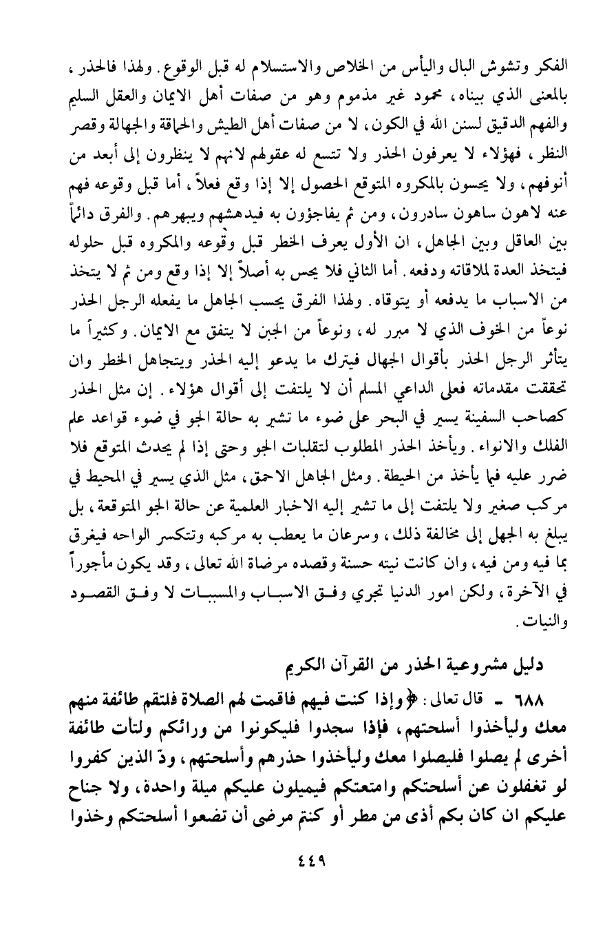 الفكر وتشوّش البال، واليأس من الخلاص، والاستسلام له قبل الوقوع، ولهذا فالحذر بالمعنى الذي بيَّنَّاه محمود غير مذموم، وهو من صفات أهل الإيمان والعقل السليم والفهم الدقيق لسنن الله في الكون، لا من صفات أهل الطيش والحماقة والجهالة وقِصَر النظر، فهؤلاء لا يعرفون الحَذَر ولا تَتَّسِع له عقولهم؛ لأنهم لا ينظرون إلى أبعد من أنوفهم، ولا يحسّون بالمكروه المتوقَّع الحصول، إلّا إذا وقع فعلًا، أمَّا قبل وقوعه فهم عنه لاهون ساهون سادرون، ومن ثَمَّ يفاجئون به، فيدهشهم ويبهرم. والفرق دائمًا بين العاقل والجاهل أنَّ الأول يعرف الخطر قبل وقوعه، والمكروه قبل حلوله، فيتَّخذ العُدَّة لملاقاته ودفعه. أمَّا الثاني فلا يحسّ به أصلًا إلّا إذا وقع، ومن ثَمَّ لا يتخذ من الأسباب ما يدفعه أو يتوقاه، ولهذا الفرق يحسب الجاهل ما يفعله الرجل الحَذِرُ نوعًا من الخوف الذي لا مبرِّرَ له، ونوعًا من الجُبْن لا يتفق مع الإيمان، وكثيرًا ما يتأثَّر الرجل الحَذِرُ بأقوال الجهّال، فيترك ما يدعو إليه الحََذَر، ويتجاهل الخطر وإن تحققت مقدماته، فعلى الداعي المسلم أن لا يلتفت إلى أقوال هؤلاء. إنَّ مَثَلَ الحَذِرِ كصاحب السفينة يسير في البحر على ضوء ما تشير به حالة الجو، في ضوء قواعد علم الفلك والأنواء، ويأخذ الحذر المطلوب لتقلُّبات الجوِّ، وحتى إذا لم يحدث المتوقع فلا ضرر عليه فيما يأخذ من الحيطة، ومَثَلُ الجاهل الأحمق مَثَلُ الذي يسير في المحيط في مركب صغير، ولا يلتفت إلى ما تشير إليه الأخبار العلمية عن حالة الجو المتوقعة، بل يبلغ به الجهل إلى مخالفة ذلك، وسرعان ما يعطب به مركبه، وتتكسر ألواحه فيغرق بما فيه ومن فيه، وإن كانت نيته حسنة، وقصده مرضاة الله تعالى، وقد يكون مأجورًا في الآخرة، ولكن أمور الدنيا تجري وفق الأسباب والمسببات، لا وفق القصود والنيات.