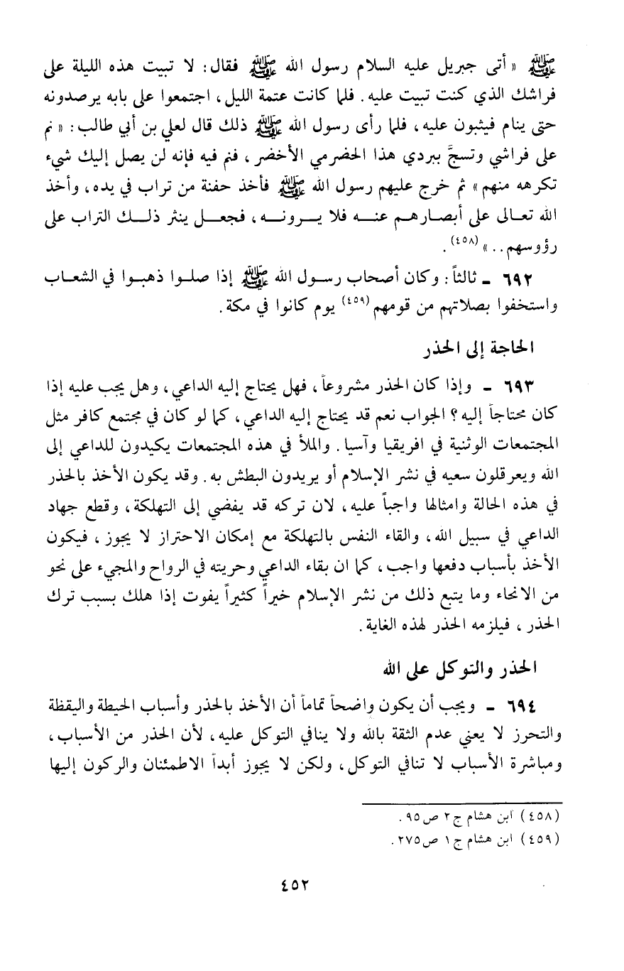 694- ويجب أن يكون واضحًا تمامًا أنَّ الأخذ بالحذر وأسباب الحيطة واليقظة والتحرُّز لا يعني عدم الثقة بالله، ولا ينافي التوكُّل عليه؛ لأنَّ الحذر من الأسباب، ومباشرة الأسباب لا تنافي التوكُّل، ولكن لا يجوز أبدًا الاطمئنان والركون إليها،