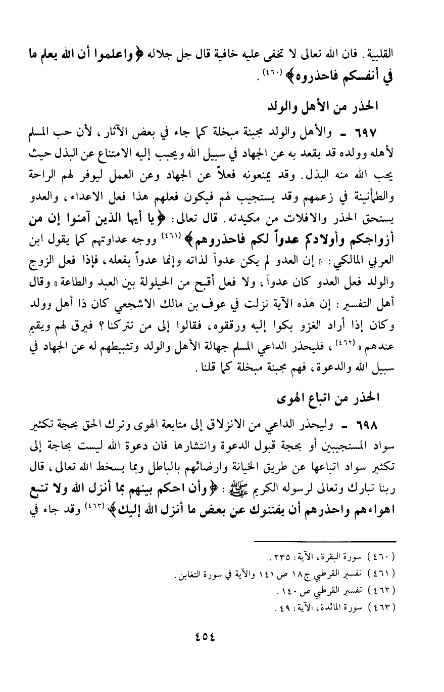 697- والأهل والولد مجبنة مبخلة، كما جاء في بعض الآثار؛ لأنَّ حب المسلم لأهله وولده قد يقعد به عن الجهاد في سبيل الله، ويحبّّب إليه الامتناع عن البذل حيث يحب الله منه البذل، وقد يمنعونه فعلًا عن الجهاد وعن العمل؛ ليوفر لهم الراحة والطمأنينة في زعمهم، وقد يستجيب لهم، فيكون فعلهم هذا فعل الأعداء، والعدو يستحق الحذر والإفلات من مكيدته، قال تعالى: {يَا أَيُّهَا الَّذِينَ آمَنُوا إِنَّ مِنْ أَزْوَاجِكُمْ وَأَوْلادِكُمْ عَدُوًّا لَكُمْ فَاحْذَرُوهُمْ} 2، ووجه عداوتهم كما يقول ابن العربي المالكي: "إن العدو لم يكن عدوًّا لذاته، وإنما عدوًّا بفعله، فإذا فعل الزوج والولد فعل العدو كان عدوًّا، ولا فعل أقبح من الحيلولة بين العبد والطاعة"، وقال أهل التفسير: إنَّ هذه الآية نزلت في عوف بن مالك الأشجعي، كان ذا أهلٍ وولد، وكان إذا أراد الغزو بكوا إليه ورققوه، فقالوا: إلى من تتركنا؟ فيرِقُّ لهم ويقيم عندهم"3، فليحذر الداعي المسلم جهالة الأهل والولد وتثبيطهم له عن الجهاد في سبيل الله والدعوة، فهم مجبنة مبخلة كما قلنا.