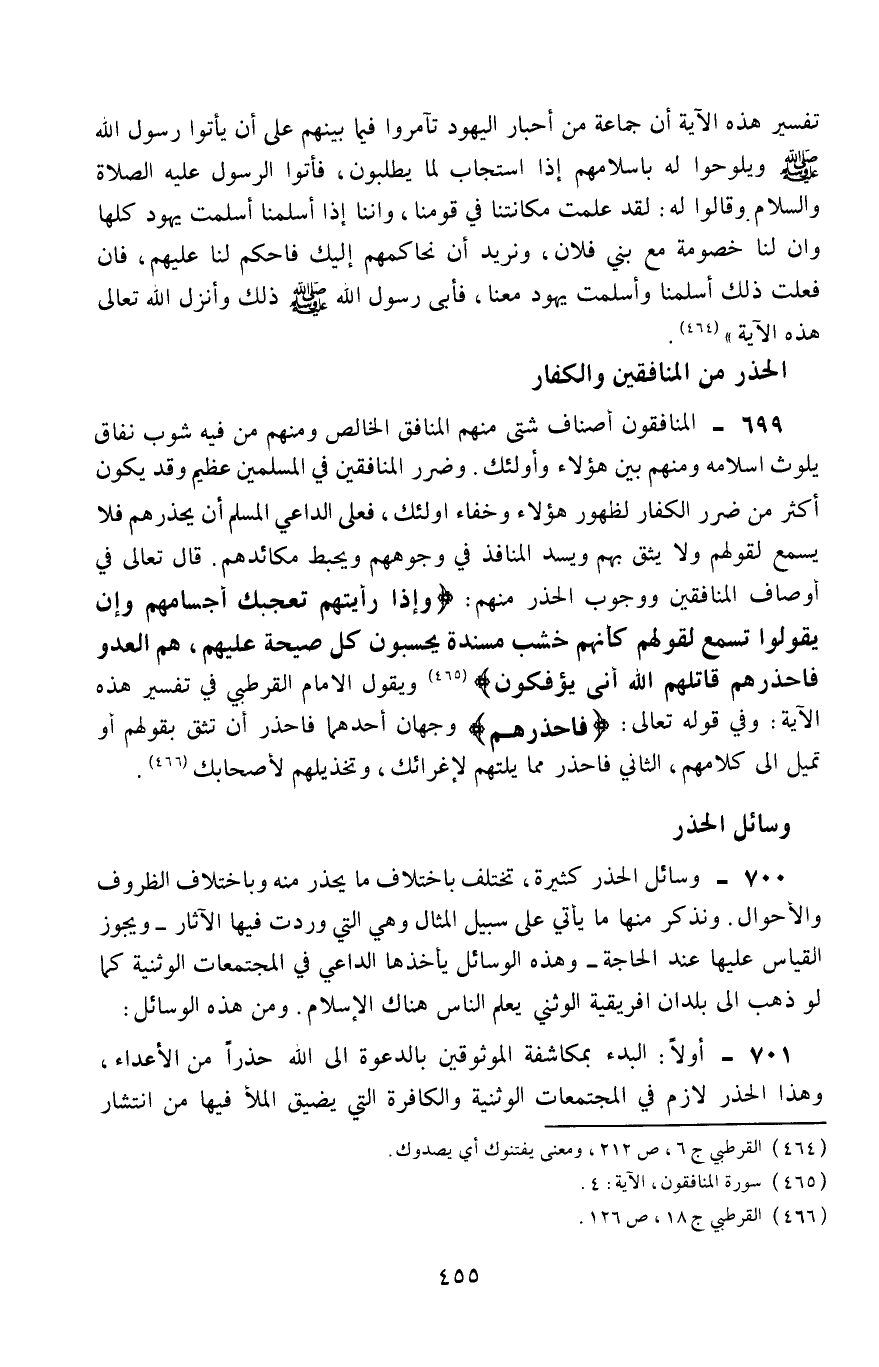 699- المنافقون أصناف شتَّى، منهم: المنافق الخالص، ومنهم من فيه شوب نفاق يلوّث إسلامه، ومنهم بين هؤلاء وأولئك. وضرر المنافقين في المسلمين عظيم، وقد يكون أكثر من ضرر الكفَّار؛ لظهور هؤلاء وخفاء أولئك، فعلى الداعي المسلم أن يحذرهم، فلا يسمع لقولهم، ولا يثق بهم، ويسد المنافذ في وجوهم، ويحبط مكائدهم، قال تعالى في أوصاف المنافقين ووجوب الحذر منهم: {وَإِذَا رَأَيْتَهُمْ تُعْجِبُكَ أَجْسَامُهُمْ وَإِنْ يَقُولُوا تَسْمَعْ لِقَوْلِهِمْ كَأَنَّهُمْ خُشُبٌ مُسَنَّدَةٌ يَحْسَبُونَ كُلَّ صَيْحَةٍ عَلَيْهِمْ هُمُ الْعَدُوُّ فَاحْذَرْهُمْ قَاتَلَهُمُ اللَّهُ أَنَّى يُؤْفَكُونَ} 2، ويقول الإمام القرطبي في تفسير هذه الآية: وفي قوله تعالى: {فَاحْذَرْهُم} وجهان؛ أحدهما: فاحذر أن تثق بقولهم، أو تميل إلى كلامهم، الثاني: فاحذر مما يلتهم لإغرائك، وتخذيلهم لأصحابك3.