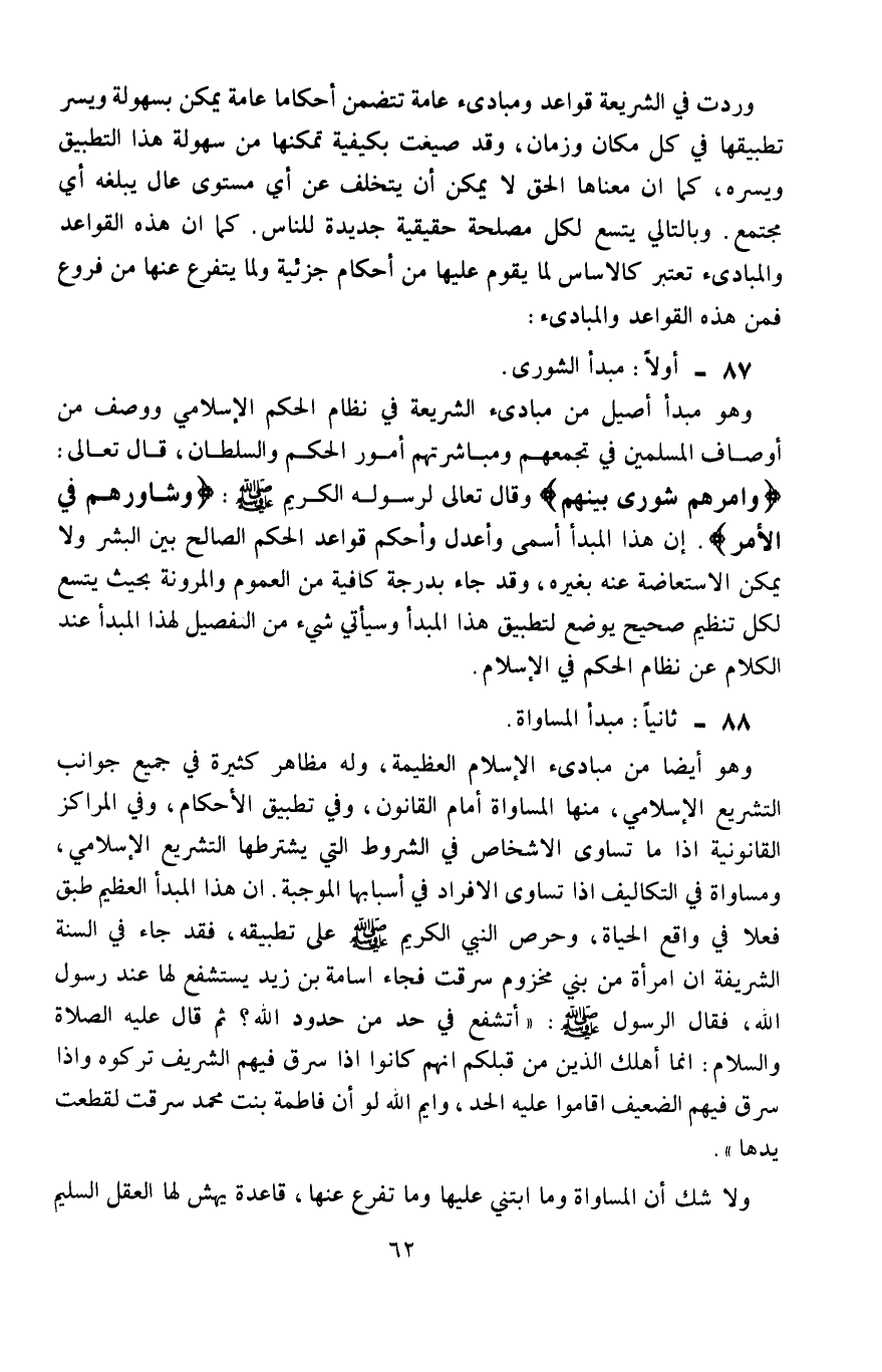 وهو مبدأ أصيل من مبادئ الشريعة في نظام الحكم الإسلامي، ووصف من أوصاف المسلمين في تجمعهم ومباشرتهم أمور الحكم والسلطان، قال تعالى: {وَأَمْرُهُمْ شُورَى بَيْنَهُمْ} ، وقال تعالى لرسوله الكريم -صلى الله عليه وسلم: {وَشَاوِرْهُمْ فِي الْأَمْرِ} ، إنَّ هذا المبدأ أسمى وأعدل وأحكم قواعد الحكم الصالح بين البشر، ولا يمكن الاستعاضة عنه بغيره، وقد جاء بدرجة كافية من العموم والمرونة؛ بحيث يتَّسع لكل تنظيم صحيح يوضع لتطبيق هذا المبدأ، وسيأتي شيء من التفصيل لهذا المبدأ عند الكلام عن نظام الحكم في الإسلام.