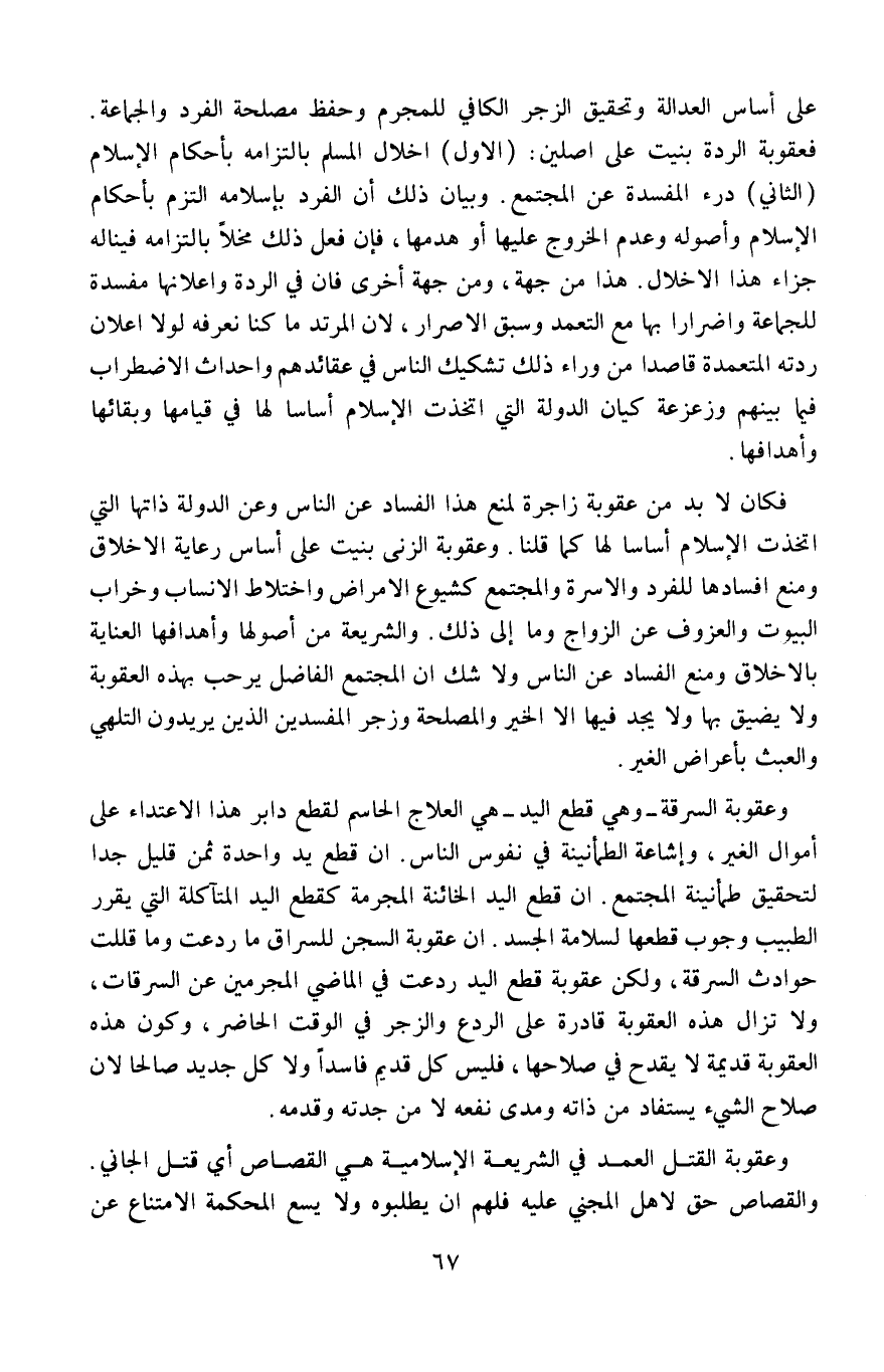 وعقوبة السرقة -وهي قطع اليد- هي العلاج الحاسم لقطع دابر هذا الاعتداء على أموال الغير، وإشاعة الطمأنينة في نفوس الناس، إنَّ قطع يد واحدة ثمن قليل جدًّا لتحقيق طمأنينة المجتمع. إنَّ قطع اليد الخائنة المجرمة كقطع اليد المتآكلة التي يقرر الطبيب وجوب قطعها لسلامة الجسد، إنَّ عقوبة السجن للسرَّاق ما ردعت وما قلَّلت حوادث السرقة، ولكن عقوبة قطع اليد ردعت في الماضي المجرمين عن السرقات.