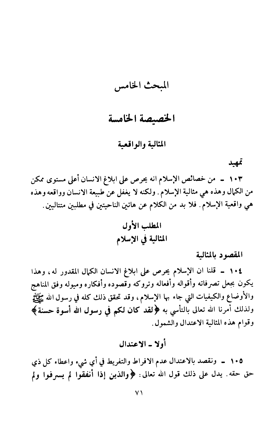 103- من خصائص الإسلام أنَّه يحرص على إبلاغ الإنسان أعلى مستوى ممكن من الكمال، وهذه هي مثالية الإسلام، ولكنه لا يغفل عن طبيعة الإنسان وواقعه، وهذه هي واقعية الإسلام. فلا بُدَّ من الكلام عن هاتين الناحيتين في مطلبين متتاليين.