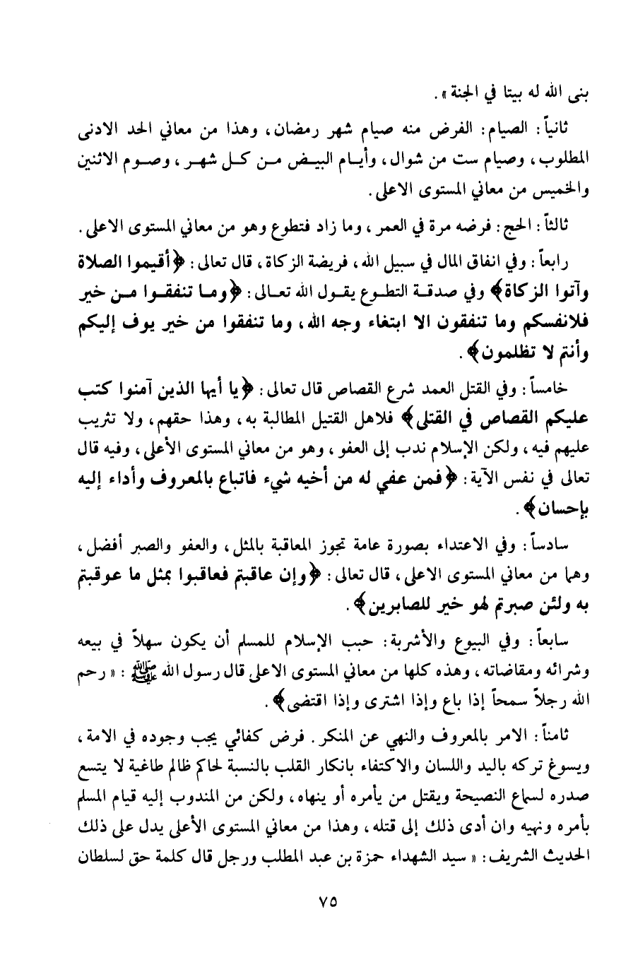 ثامنًا: الأمر بالمعروف والنهي عن المنكر: فرض كفائي يجب وجوده في الأمة، ويسوغ تركه باليد واللسان، والاكتفاء بإنكار القلب بالنسبة لحاكم ظالم طاغية لا يتَّسع صدره لسماع النصيحة ويقتل من يأمره أو ينهاه، ولكن من المندوب إليه قيام المسلم بأمره ونهيه، وإن أدى ذلك إلى قتله، وهذا من معاني المستوى الأعلى، يدل على ذلك الحديث الشريف: "سيد الشهداء حمزة بن عبد المطلب، ورجل قال كلمة حق لسلطان