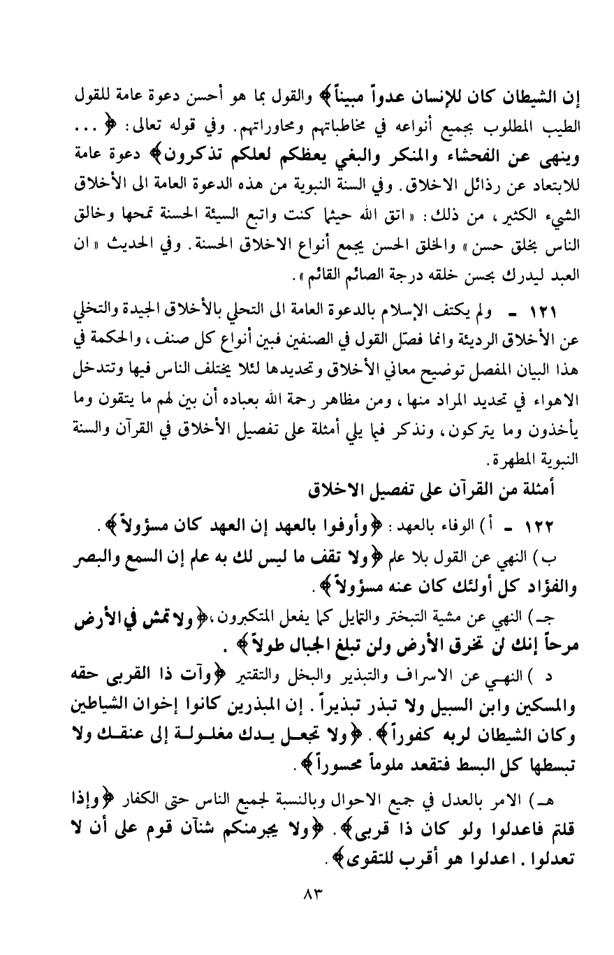 إِنَّ الشَّيْطَانَ كَانَ لِلْإِنْسَانِ عَدُوًّا مُبِينًا} ، والقول بما هو أحسن دعوة عامَّة للقول الطيب المطلوب بجميع أنواعه في مخاطباتهم ومحاوراتهم، في قوله تعالى: {وَيَنْهَى عَنِ الْفَحْشَاءِ وَالْمُنْكَرِ وَالْبَغْيِ يَعِظُكُمْ لَعَلَّكُمْ تَذَكَّرُون} دعوة عامَّة للابتعاد عن رذائل الأخلاق، وفي السنة النبوية من هذه الدعوة العامة إلى الأخلاق الشيء الكثير، من ذلك: "اتق الله حيثما كنت وأتبع السيئة الحسنة تمحها وخالق الناس بخلق حسن"، والخلق الحسن يجمع أنواع الأخلاق الحسنة، وفي الحديث: "إنَّ العبد ليدرك بحسن حلقه درجة الصائم القائم".