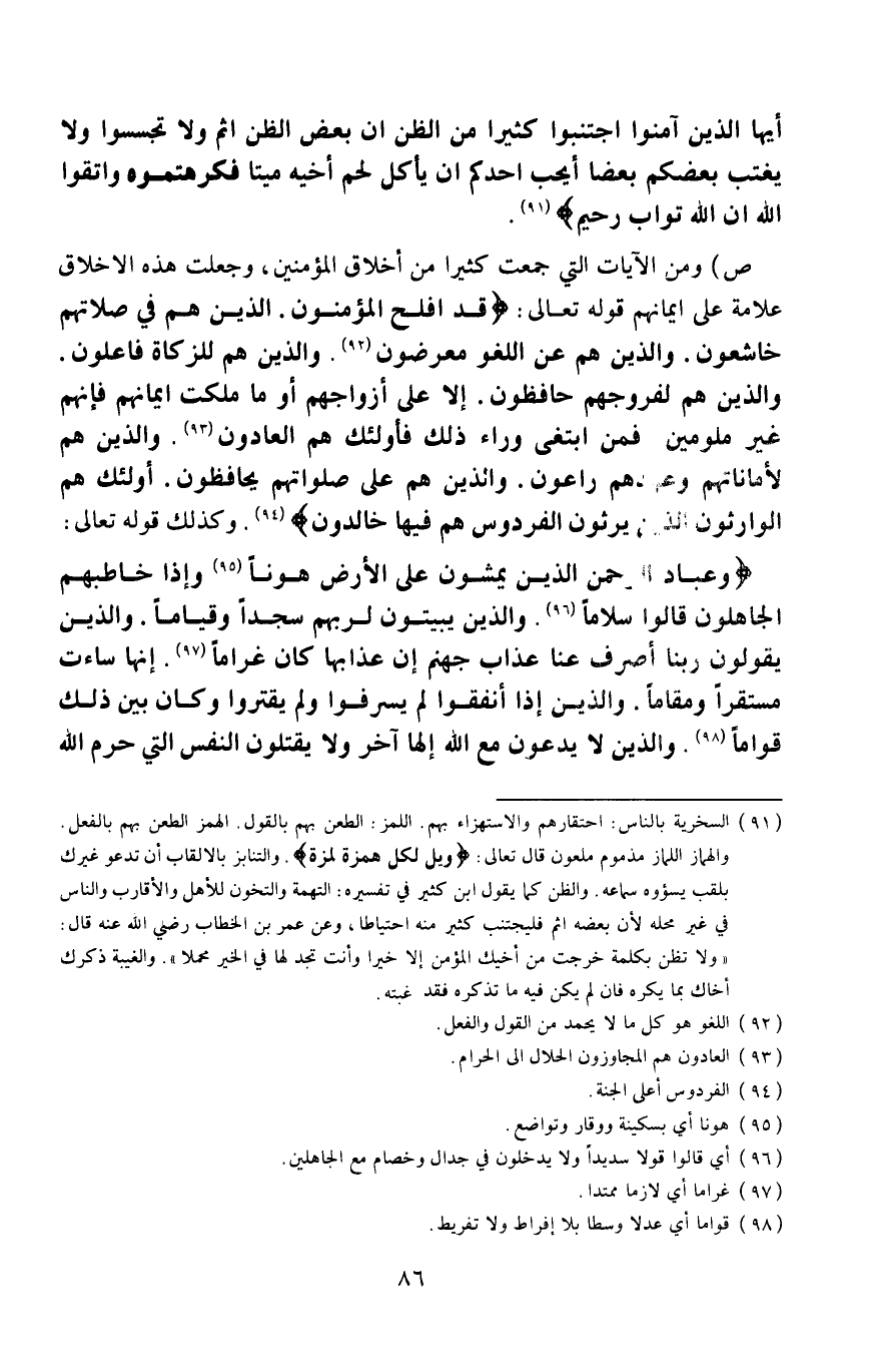 ص- ومن الآيات التي جمعت كثيرًا من أخلاق المؤمنين، وجعلت هذه الأخلاق علامة على أيمانهم قوله تعالى: {قَدْ أَفْلَحَ الْمُؤْمِنُونَ، الَّذِينَ هُمْ فِي صَلَاتِهِمْ خَاشِعُونَ، وَالَّذِينَ هُمْ عَنِ اللَّغْوِ مُعْرِضُونَ 2، وَالَّذِينَ هُمْ لِلزَّكَاةِ فَاعِلُونَ، وَالَّذِينَ هُمْ لِفُرُوجِهِمْ حَافِظُونَ، إِلَّا عَلَى أَزْوَاجِهِمْ أوْ مَا مَلَكَتْ أَيْمَانُهُمْ فَإِنَّهُمْ غَيْرُ مَلُومِينَ، فَمَنِ ابْتَغَى وَرَاءَ ذَلِكَ فَأُولَئِكَ هُمُ الْعَادُونَ 3، وَالَّذِينَ هُمْ لأَمَانَاتِهِمْ وَعَهْدِهِمْ رَاعُونَ، وَالَّذِينَ هُمْ عَلَى صَلَوَاتِهِمْ يُحَافِظُونَ، أُولَئِكَ هُمُ الْوَارِثُونَ، الَّذِينَ يَرِثُونَ الْفِرْدَوْسَ هُمْ فِيهَا خَالِدُونَ} 4، وكذلك قوله تعالى: {وَعِبَادُ الرَّحْمَنِ الَّذِينَ يَمْشُونَ عَلَى الْأَرْضِ هَوْنًا 5 وَإِذَا خَاطَبَهُمُ الْجَاهِلُونَ قَالُوا سَلَامًا 6، وَالَّذِينَ يَبِيتُونَ لِرَبِّهِمْ سُجَّدًا وَقِيَامًا، وَالَّذِينَ يَقُولُونَ رَبَّنَا اصْرِفْ عَنَّا عَذَابَ جَهَنَّمَ إِنَّ عَذَابَهَا كَانَ غَرَامًا 7، إِنَّهَا سَاءَتْ مُسْتَقَرًّا وَمُقَامًا، وَالَّذِينَ إِذَا أَنْفَقُوا لَمْ يُسْرِفُوا وَلَمْ يَقْتُرُوا وَكَانَ بَيْنَ ذَلِكَ قَوَامًا 8، وَالَّذِينَ لا يَدْعُونَ مَعَ اللَّهِ إِلَهًا آخَرَ وَلا يَقْتُلُونَ النَّفْسَ الَّتِي حَرَّمَ اللَّهُ