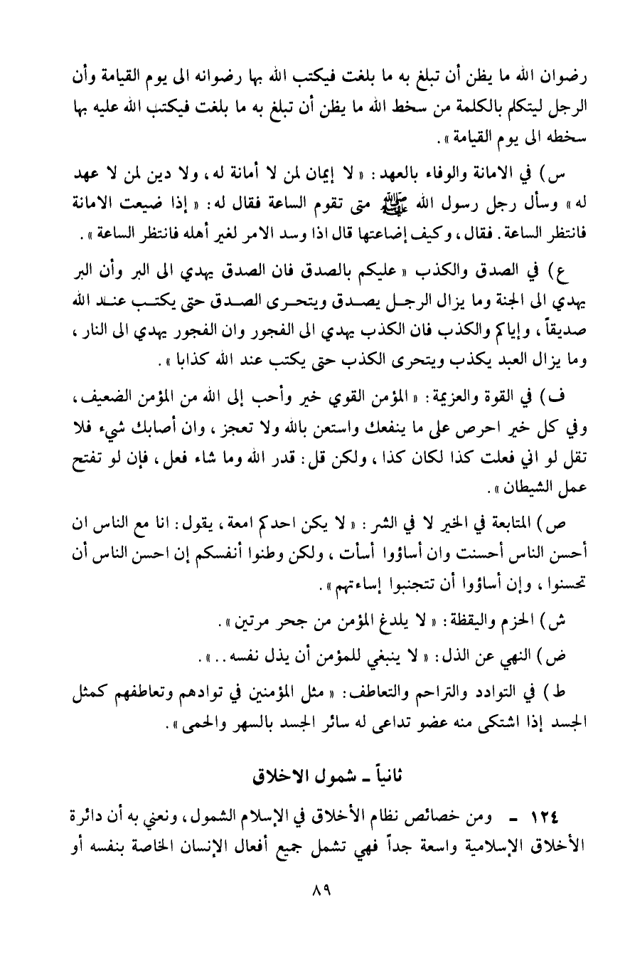 124- ومن خصائص نظام الأخلاق في الإسلام الشمول، ونعني به أنَّ دائرة الأخلاق الإسلامية واسعة جدًّا، فهي تشمل جميع أفعال الإنسان الخاصة بنفسه أو
