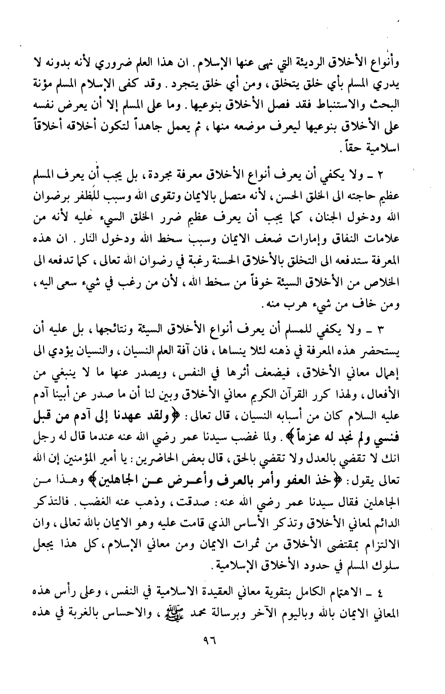 3- ولا يكفي للمسلم أن يعرف أنواع الأخلاق السيئة ونتائجها، بل عليه أن يستحضر هذه المعرفة في ذهنه لئلَّا ينساها، فإن آفة العلم النسيان، والنسيان يؤدي إلى إهمال معاني الأخلاق، فيضعف أثرها في النفس، ويصدر عنها ما لا ينبغي من الأفعال، ولهذا كرَّر القرآن الكريم معاني الأخلاق وبيِّنَ لنا أنَّ ما صدر عن أبينا آدم -عليه السلام- كان من أسبابه النسيان، قال تعالى: {وَلَقَدْ عَهِدْنَا إِلَى آدَمَ مِنْ قَبْلُ فَنَسِيَ وَلَمْ نَجِدْ لَهُ عَزْمًا} ، ولمَّا غضب سيدنا عمر -رضي الله عنه- عندما قال له رجل: إنك لا تقضي بالعدل ولا تقضي بالحق، قال بعض الحاضرين: يا أمير المؤمنين، إن الله تعالى يقول: {خُذِ الْعَفْوَ وَأْمُرْ بِالْعُرْفِ وَأَعْرِضْ عَنِ الْجَاهِلِينَ} ، وهذا من الجالهين، فقال سيدنا عمر -رضي الله عنه: صدقت، وذهب عنه الغضب، فالتذكُّر الدائم لمعاني الأخلاق وتذكُّر الأساس الذي قامت عليه وهو الإيمان بالله تعالى، وإن الالتزام بمقتضى الأخلاق من ثمرات الإيمان ومن معاني الإسلام، كل هذا يجعل سلوك المسلم في حدود الأخلاق الإسلامية.