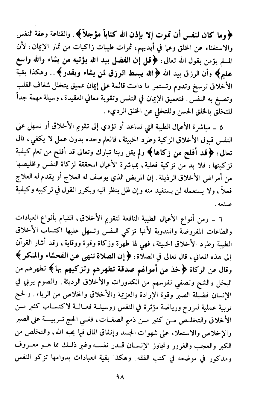 {وَمَا كَانَ لِنَفْسٍ أَنْ تَمُوتَ إِلَّا بِإِذْنِ اللَّهِ كِتَابًا مُؤَجَّلًا} ، والقناعة وعِفَّة النفس والاستغناء عن الخلق وعمَّا في أيديهم، ثمرات طيبات زاكيات من ثمار الإيمان؛ لأن المسلم يؤمن بقول الله تعالى: {قُلْ إِنَّ الْفَضْلَ بِيَدِ اللَّهِ يُؤْتِيهِ مَنْ يَشَاءُ وَاللَّهُ وَاسِعٌ عَلِيمٌ} ، وأن الرزق بيد الله {اللَّهُ يَبْسُطُ الرِّزْقَ لِمَنْ يَشَاءُ وَيَقْدِرُ} ، وهكذا بقية الأخلاق ترسخ وتدوم وتستمر ما دامت قائمة على إيمان عميق يتخلَّل شغاف القلب وتصبغ به النفس، فتعميق الإيمان في النفس وتقوية معاني العقيدة وسيلة مهمة جدًّا للتخلق بالخلق الحسن، وللتخلي عن الخلق الرديء.