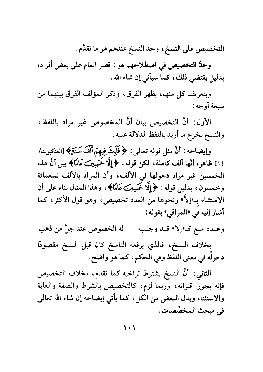 الثاني: أنَّ النسخ يشترط تراخيه كما تقدم، بخلاف التخصيص فإنه يجوز اقترانه، وربما لزم، كالتخصيص بالشرط والصفة والغاية والاستثناء وبدل البعض من الكل، كما يأتي إيضاحه إن شاء اللَّه تعالى في مبحث المخصِّصات.