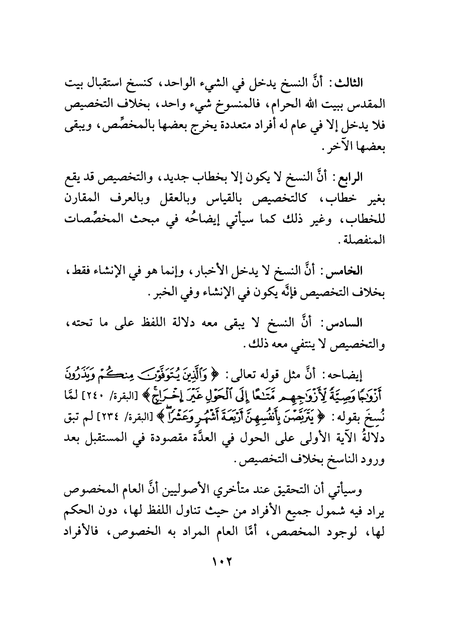 الثالث: أنَّ النسخ يدخل في الشيء الواحد، كنسخ استقبال بيت المقدس ببيت اللَّه الحرام، فالمنسوخ شيء واحد، بخلاف التخصيص فلا يدخل إلا في عام له أفراد متعددة يخرج بعضها بالمخصِّص، ويبقى بعضها الآخر.