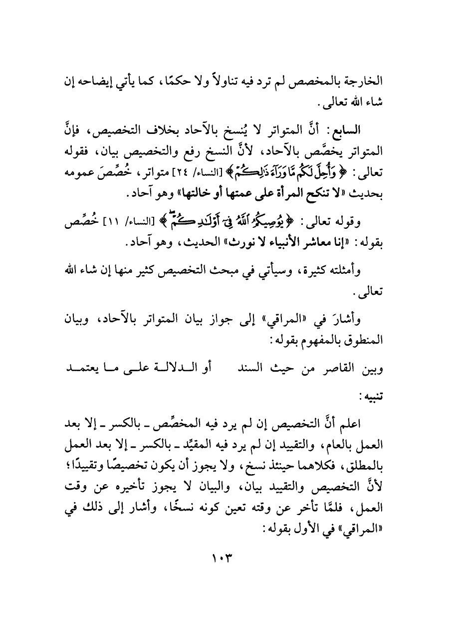السابع: أنَّ المتواتر لا يُنسخ بالآحاد بخلاف التخصيص، فإنَّ المتواتر يخصَّص بالآحاد، لأنَّ النسخ رفع والتخصيص بيان، فقوله تعالى: {وَأُحِلَّ لَكُمْ مَا وَرَاءَ ذَلِكُمْ} [النساء/ ٢٤] متواتر، خُصِّصَ عمومه بحديث "لا تنكح المرأة على عمتها أو خالتها" وهو آحاد.
