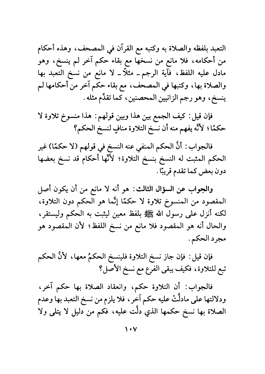 والجواب عن السؤال الثالث: هو أنه لا مانع من أن يكون أصل المقصود من المنسوخ تلاوة لا حكمًا إنَّما هو الحكم دون التلاوة، لكنه أنزل على رسول اللَّه -صلى اللَّه عليه وسلم- بلفظ معين ليثبت به الحكم وليستقر، والحال أنه هو المقصود فلا مانع من نسخ اللفظ؛ لأن المقصود هو مجرد الحكم.