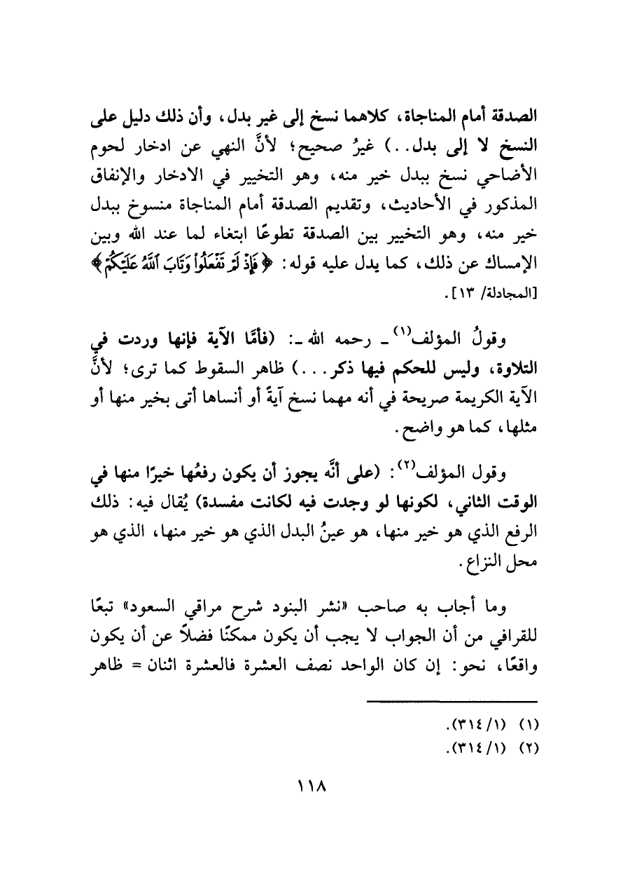 الصدقة أمام المناجاة، كلاهما نسخ إلى غير بدل، وأن ذلك دليل على النسخ لا إلى بدل. .) غيرُ صحيح؛ لأنَّ النهي عن ادخار لحوم الأضاحي نسخ ببدل خير منه، وهو التخيير في الادخار والإنفاق المذكور في الأحاديث، وتقديم الصدقة أمام المناجاة منسوخ ببدل خير منه، وهو التخيير بين الصدقة تطوعًا ابتغاء لما عند اللَّه وبين الإمساك عن ذلك، كما يدل عليه قوله: {فَإِذْ لَمْ تَفْعَلُوا وَتَابَ اللَّهُ عَلَيْكُمْ} [المجادلة/ ١٣].