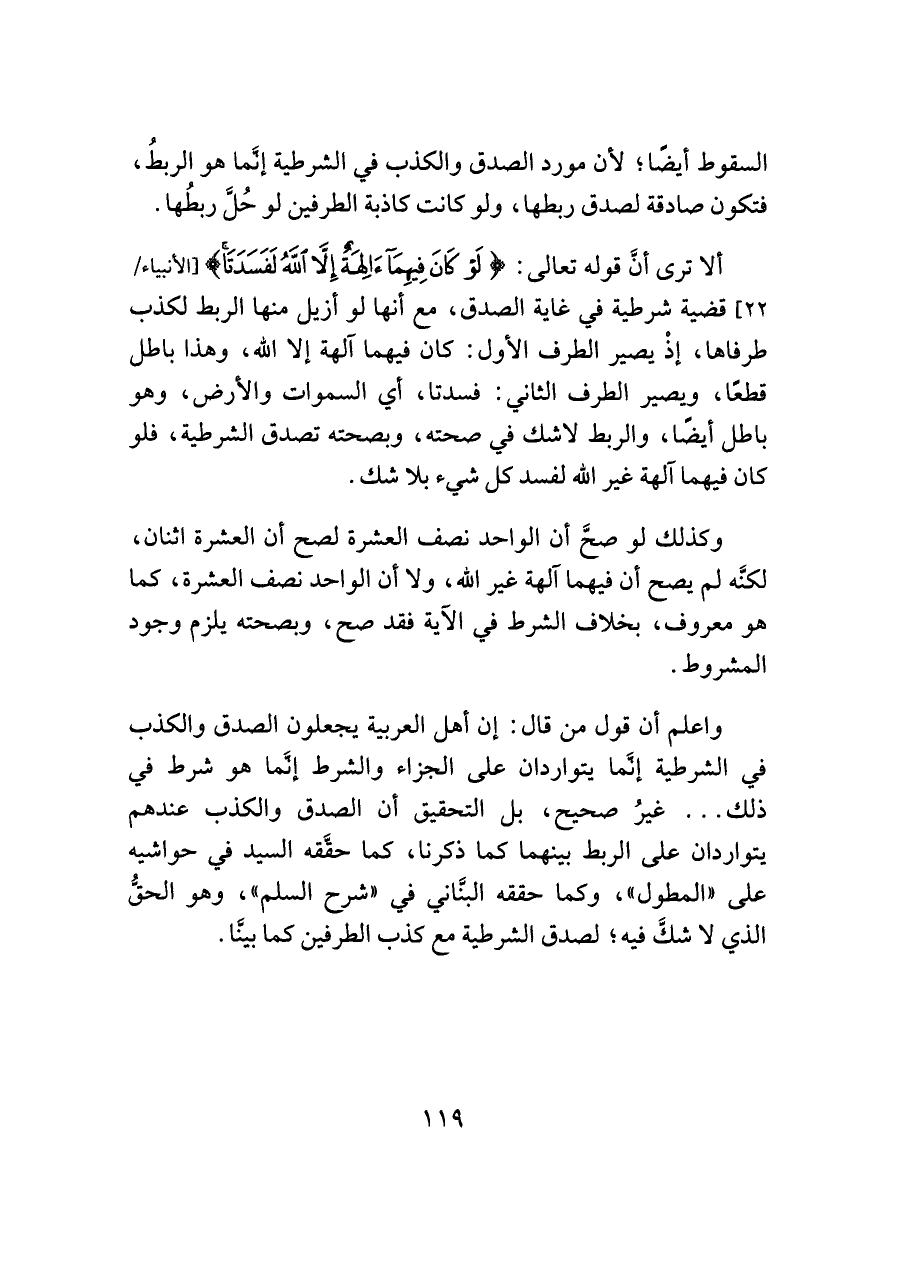 وكذلك لو صحَّ أن الواحد نصف العشرة لصح أن العشرة اثنان، لكنَّه لم يصح أن فيهما آلهة غير اللَّه، ولا أن الواحد نصف العشرة، كما هو معروف، بخلاف الشرط في الآية فقد صح، وبصحته يلزم وجود المشروط.