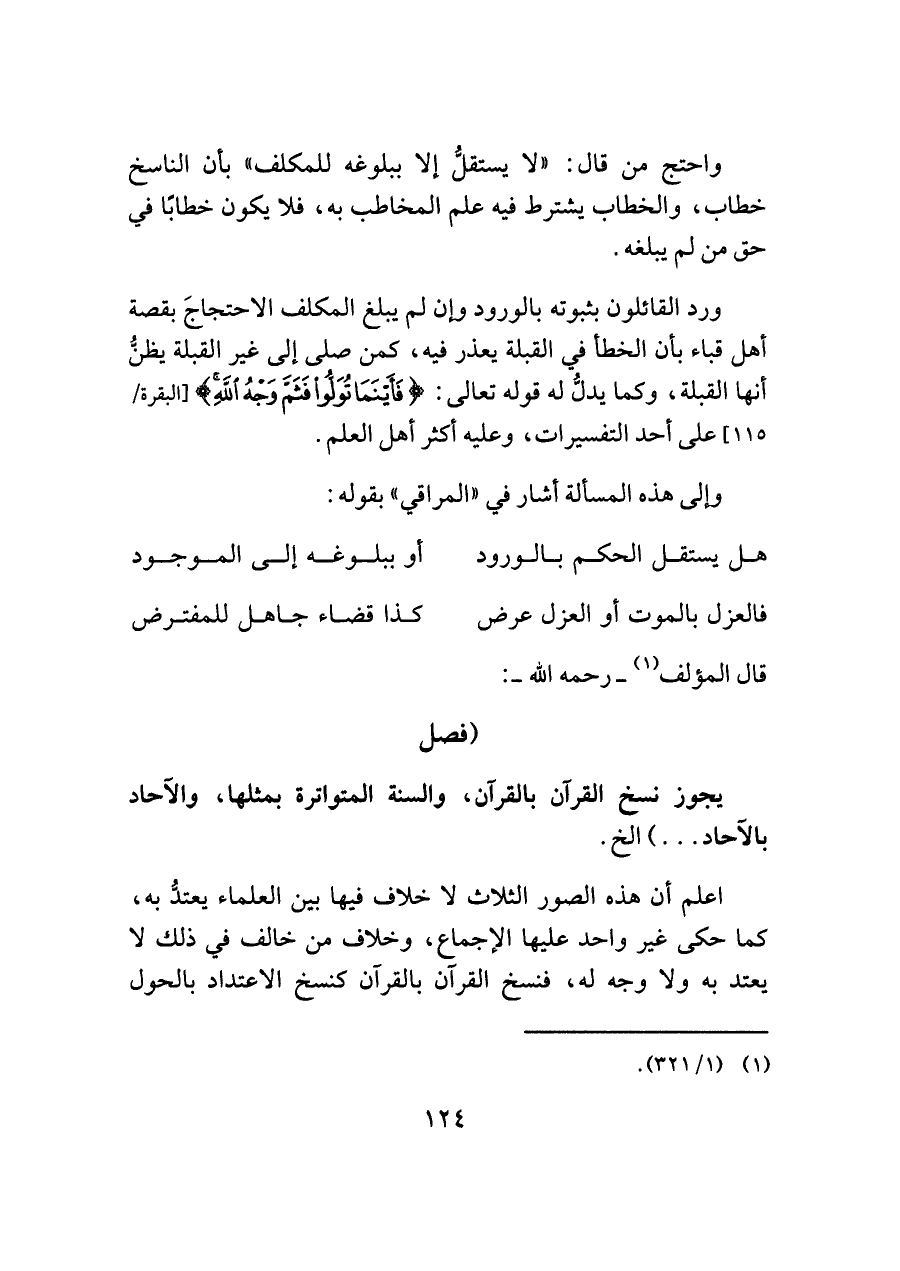 واحتج من قال: "لا يستقلُّ إلا ببلوغه للمكلف" بأن الناسخ خطاب، والخطاب يشترط فيه علم المخاطب به، فلا يكون خطابًا في حق من لم يبلغه.