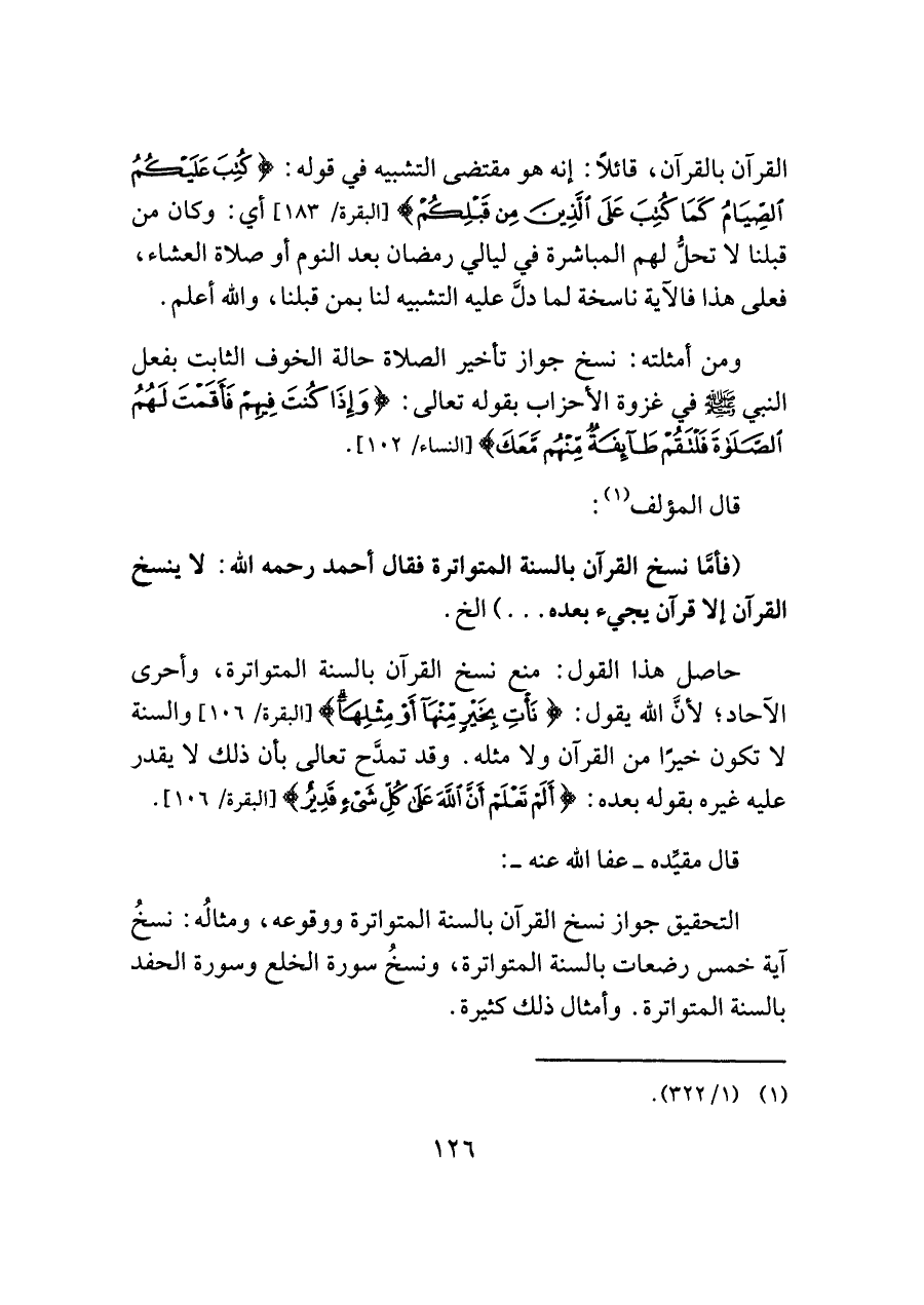 (فأمَّا نسخ القرآن بالسنة المتواترة فقال أحمد رحمه اللَّه: لا ينسخ القرآن إلا قرآن يجيء بعده. . .) الخ.