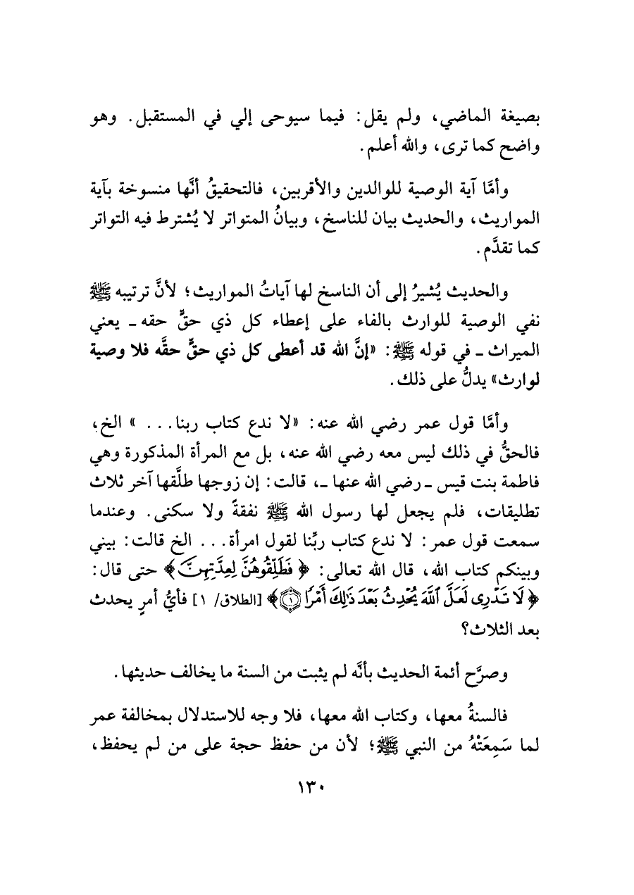 وأمَّا آية الوصية للوالدين والأقربين، فالتحقيقُ أنَّها منسوخة بآية المواريث، والحديث بيان للناسخ، وبيانُ المتواتر لا يُشترط فيه التواتر كما تقدَّم.