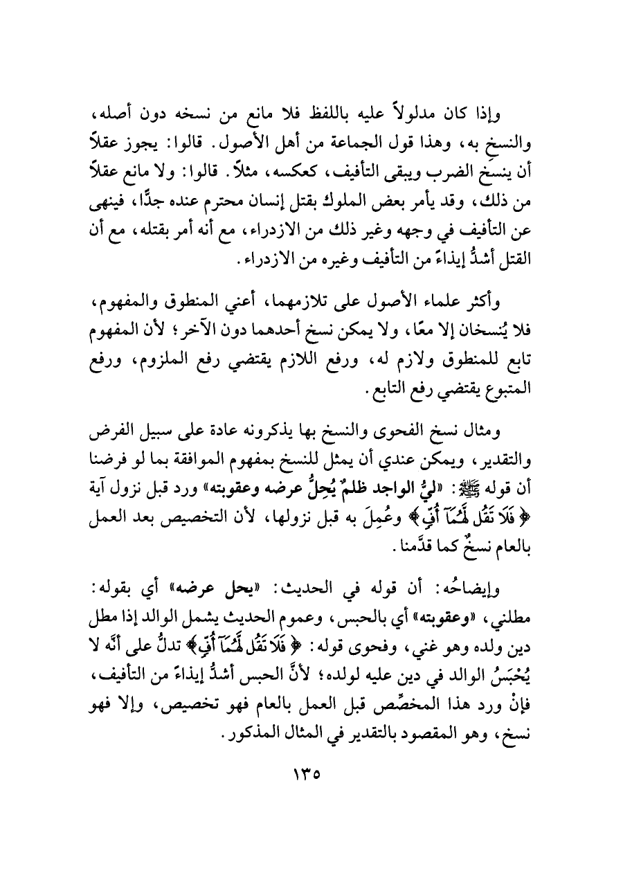 ومثال نسخ الفحوى والنسخ بها يذكرونه عادة على سبيل الفرض والتقدير، ويمكن عندي أن يمثل للنسخ بمفهوم الموافقة بما لو فرضنا أن قوله -صلى اللَّه عليه وسلم-: "ليُّ الواجد ظلمٌ يُحِلُّ عرضه وعقوبته" ورد قبل نزول آية {فَلَا تَقُلْ لَهُمَا أُفٍّ} وعُمِلَ به قبل نزولها، لأن التخصيص بعد العمل بالعام نسخٌ كما قدَّمنا.