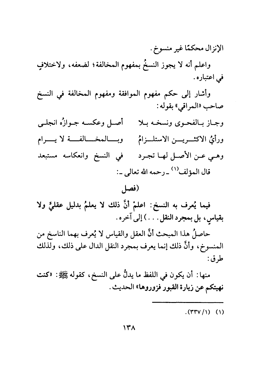 فيما يُعرف به النسخ: اعلمْ أنَّ ذلك لا يعلمُ بدليل عقليٍّ ولا بقياسٍ، بل بمجرد النقل. . .) إلى آخره.